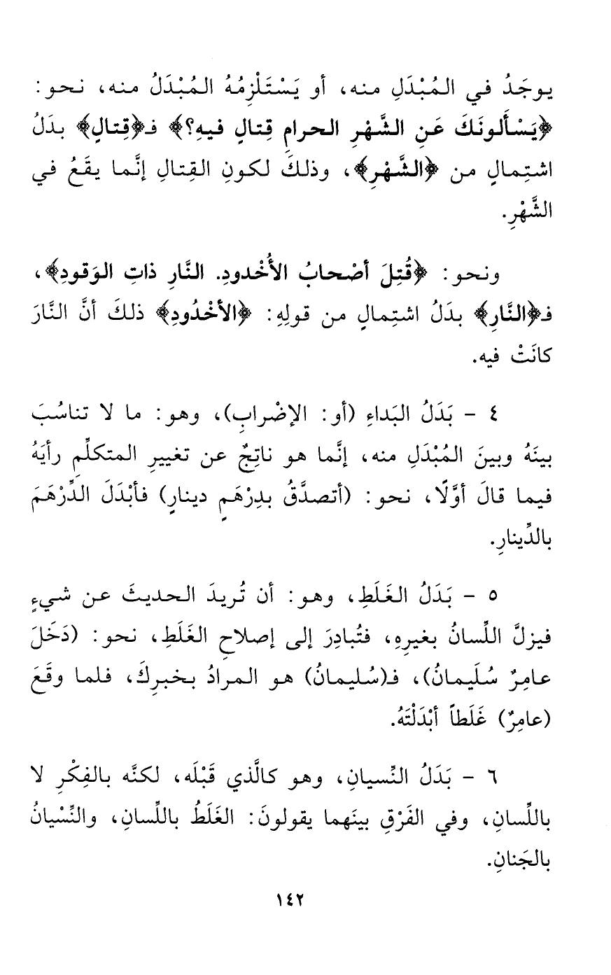 5 - بَدَلُ الغَلَطِ، وهو: أن تُريدَ الحديثَ عن شيءٍ فيزلَّ اللِّسانُ بغيرِهِ، فتُبادِرَ إلى إصلاحِ الغَلَطِ، نحو: (دَخَلَ عامِرٌ سُلَيمانُ)، فـ (سُليمانُ) هو المرادُ بخبرِكَ، فلما وقَعَ (عامِرٌ) غَلَطاً أبْدَلْتَهُ.