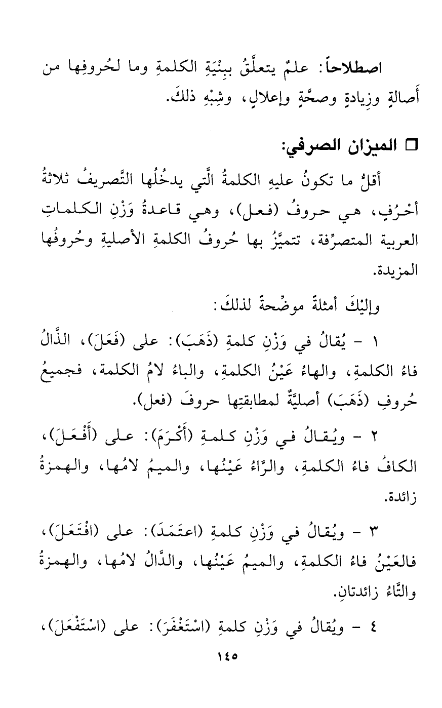 1 - يُقالُ في وَزْنِ كلمةِ (ذَهَبَ): على (فَعَلَ)، الذَّالُ فاءُ الكلمةِ، والهاءُ عَيْنُ الكلمةِ، والباءُ لامُ الكلمة، فجميعُ حُروفِ (ذَهَبَ) أصليَّةٌ لمطابقتِها حروفَ (فعل).