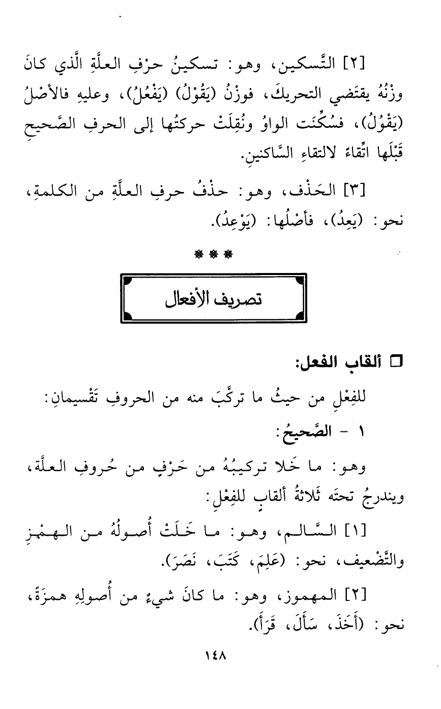 [1] السَّالم، وهو: ما خَلَتْ أُصولُهُ من الهمْزِ والتَّضْعيف، نحو: (عَلِمَ، كَتَبَ، نَصَرَ).