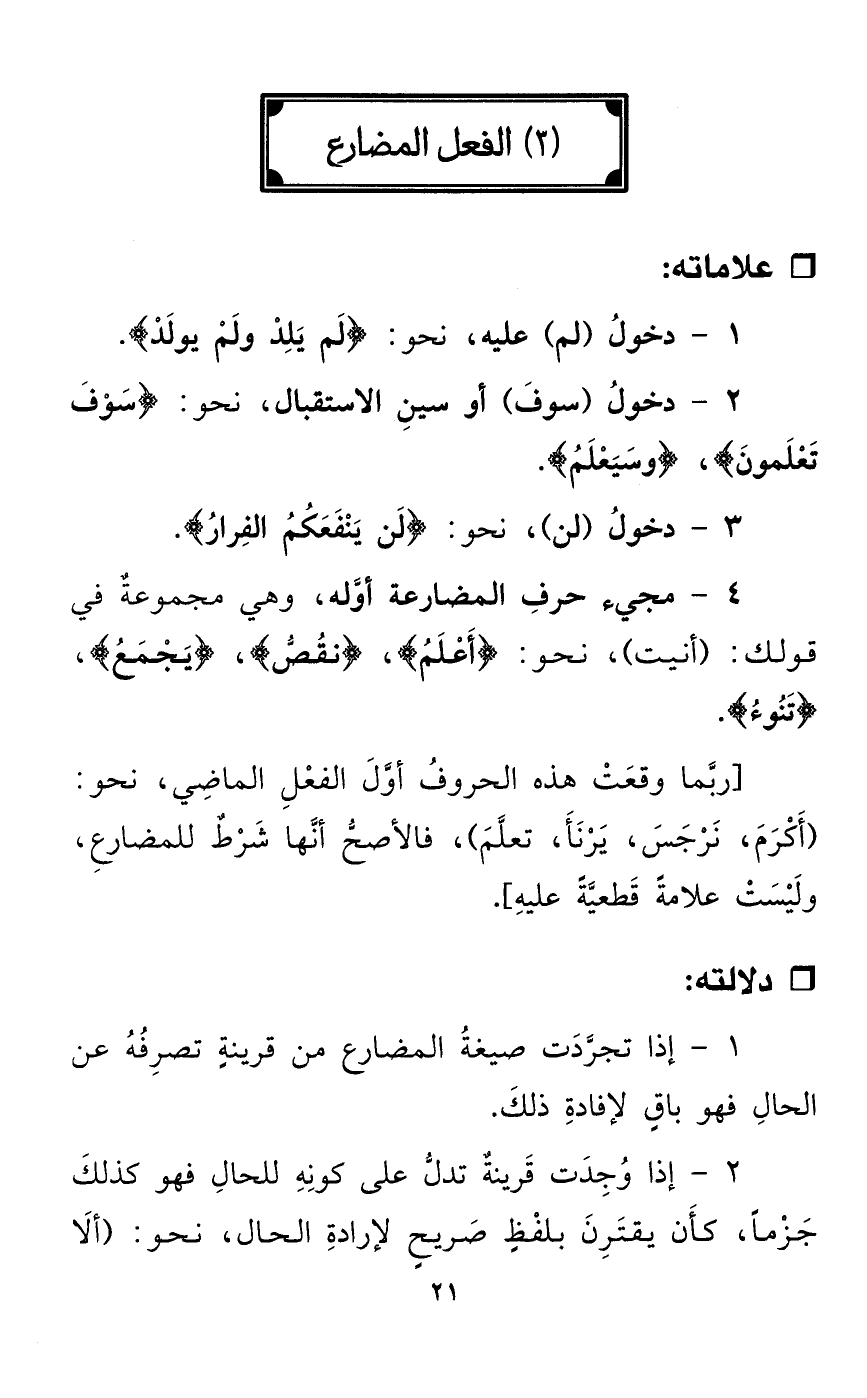 1 - دخولُ (لم) عليه، نحو: {لَم يَلِدْ ولَمْ يولَدْ}.