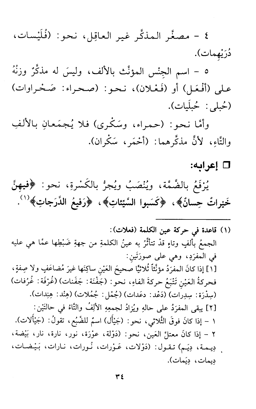[1] إذا كانَ المفرَدُ مؤنَّثاً ثُلاثيًّا صحيحَ العَيْنِ ساكِنَها غيرَ مُضاعَفٍ ولا صِفةٍ، فحركةُ العَيْنِ تَتْبَعُ حركةَ الفاءِ، نحو: (جَفْنَة: جَفَنات) (غُرْفَة: غُرُفات) (سِدْرَة: سِدِرات) (دَعْد: دعَدات) (جُمْل: جُمُلات) (هِنْد: هِنِدات).