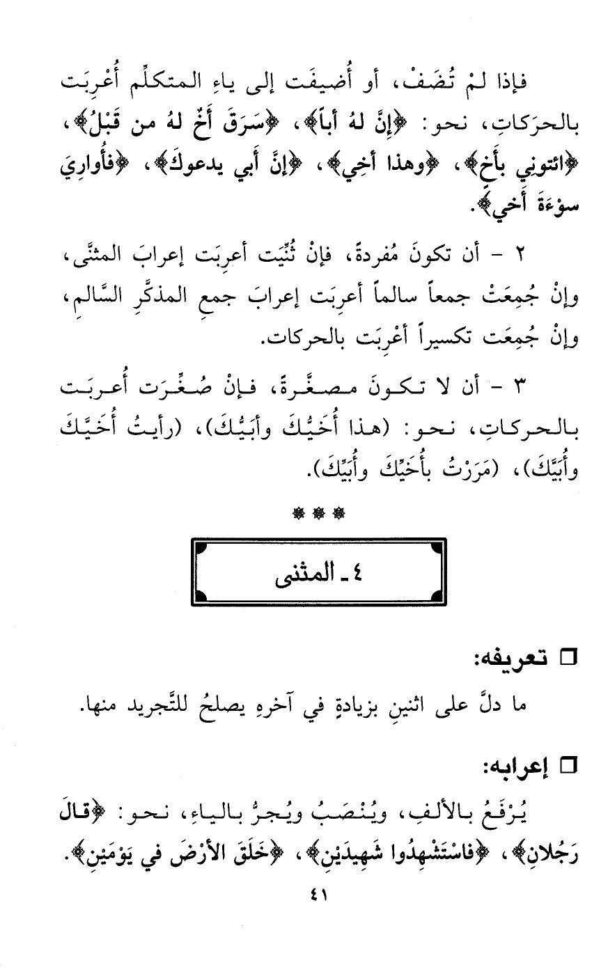 يُرْفَعُ بالألفِ، ويُنْصَبُ ويُجرُّ بالياءِ، نحو: {قالَ رَجُلانِ}، {فاسْتَشْهِدُوا شَهِيدَيْنِ}، {خَلَقَ الأرْضَ في يَوْمَينِ}.