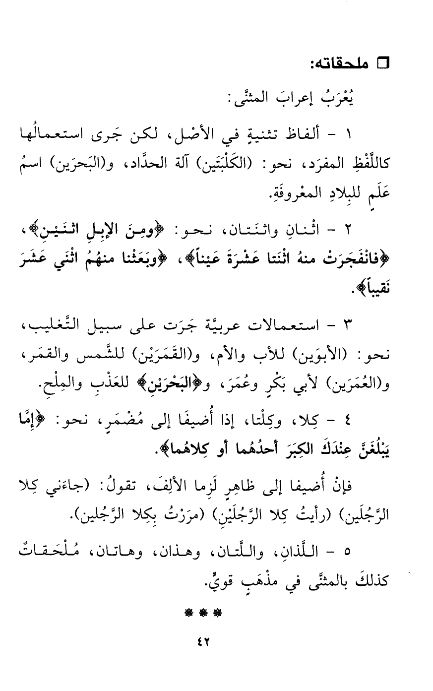 5 - اللَّذانِ، واللَّتان، وهذان، وهاتان، مُلْحَقاتٌ كذلكَ بالمثنَّى في مذْهَبٍ قويٍّ.