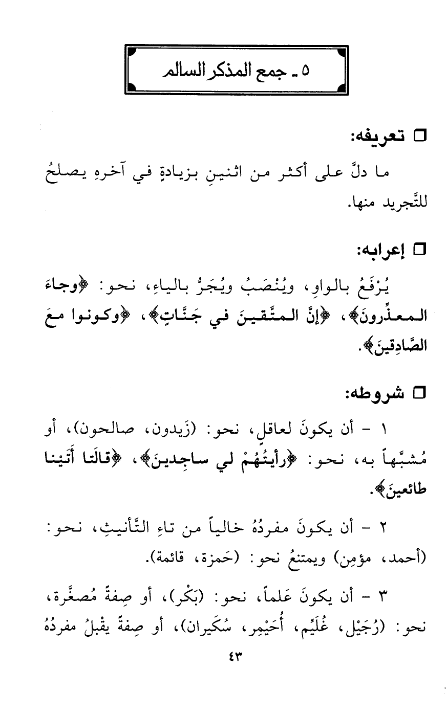 1 - أن يكونَ لعاقلٍ، نحو: (زَيدون، صالحون)، أو مُشبَّهاً به، نحو: {رأيتُهُمْ لي ساجِدينَ}، {قالَتا أَتَيْنا طائعينَ}.
