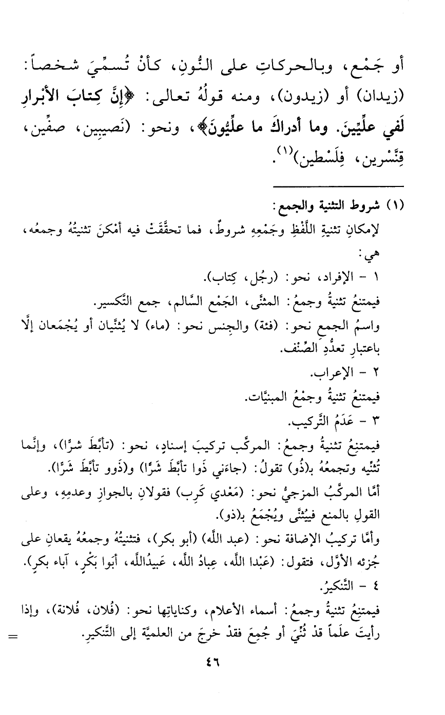 فيمتنِعُ تثنيةُ وجمعُ: أسماء الأعلام، وكناياتِها نحو: (فُلان، فُلانة)، وإذا رأيتَ علَماً قدْ ثُنِّيَ أو جُمِعَ فقدْ خرجَ من العلميَّة إلى التَّنكيرِ. =