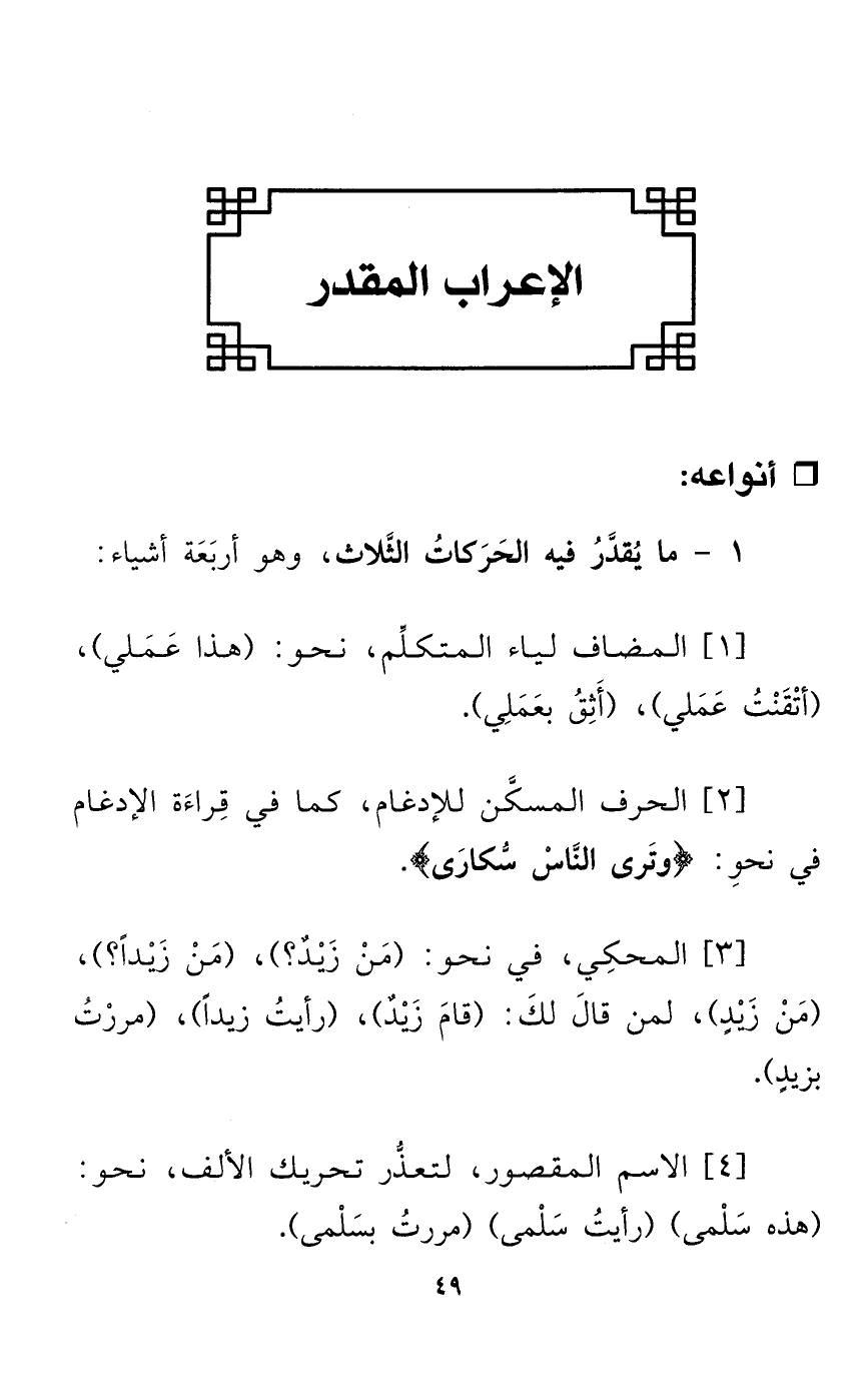 [4] الاسم المقصور، لتعذُّر تحريك الألف، نحو: (هذه سَلْمى) (رأيتُ سَلْمى) (مررتُ بسَلْمى).