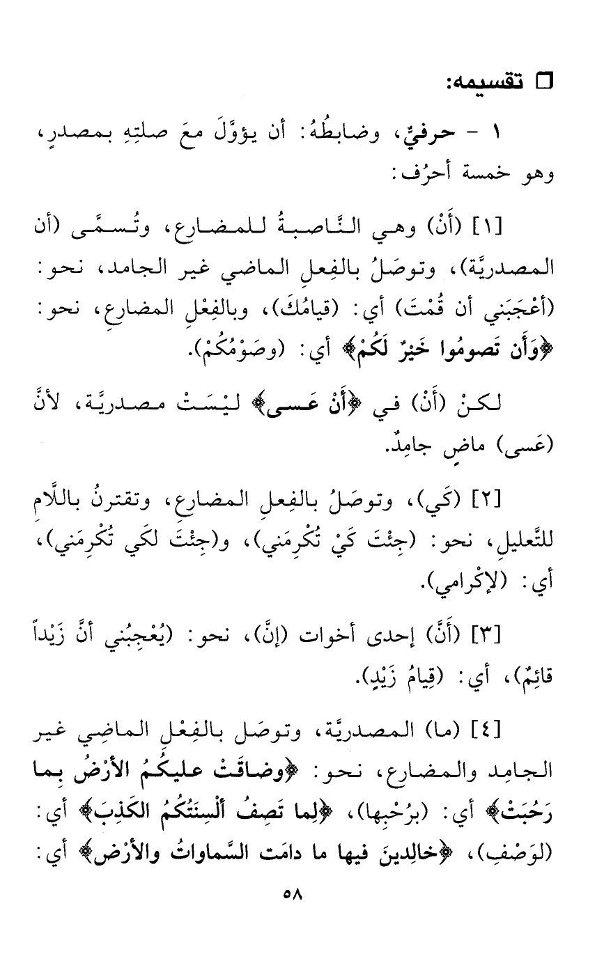 [4] (ما) المصدريَّة، وتوصَل بالفِعْلِ الماضِي غير الجامِد والمضارع، نحو: {وضاقَتْ عليكُمُ الأرْضُ بما رَحُبَتْ} أي: (برُحْبِها)، {لِما تَصِفُ ألْسِنَتُكُمُ الكَذِبَ} أيَ: (لوَصْفِ)، {خالِدينَ فيها ما دامَت السَّماواتُ والأرْض} أي: