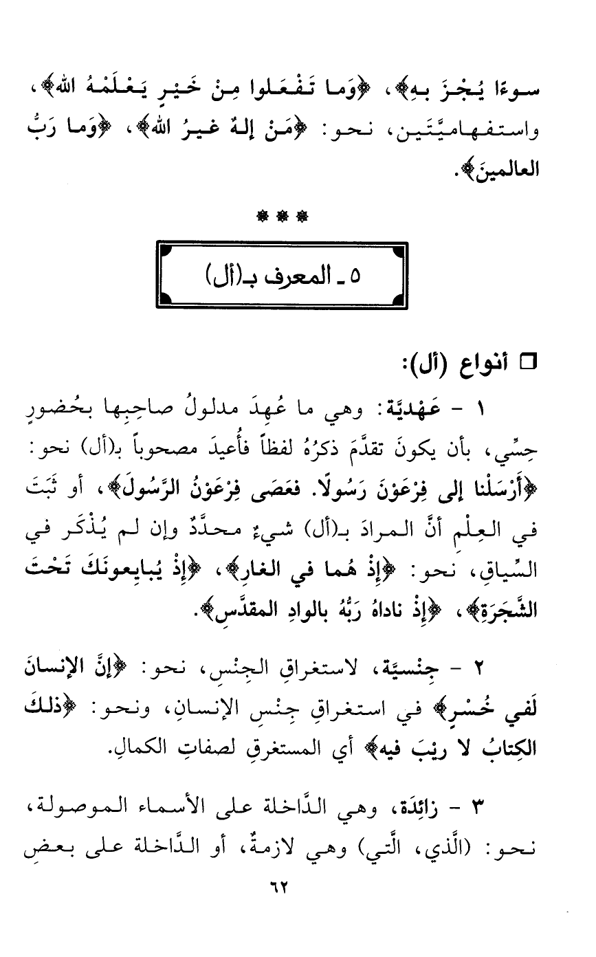 1 - عَهْديَّة: وهي ما عُهِدَ مدلولُ صاحِبِها بحُضورٍ حِسِّي، بأن يكونَ تقدَّمَ ذكرُهُ لفظاً فأُعيدَ مصحوباً بـ (أل) نحو: {أَرْسلْنا إلى فِرْعَوْنَ رَسُولاً. فعَصَى فِرْعَوْنُ الرَّسُولَ}، أو ثَبَتَ في العِلْمِ أنَّ المرادَ بـ (أل) شيءٌ محدَّدٌ وإن لم يُذْكَر في السياقِ، نحو: {إِذْ هُما في الغارِ}، {إِذْ يُبايِعونَكَ تَحْتَ الشَّجَرَةِ}، {إِذْ ناداهُ رَبُّهُ بالوادِ المقدَسِ}.