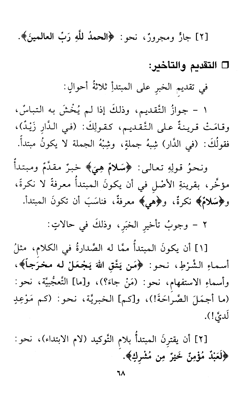 1 - جوازُ التَّقديم، وذلكَ إذا لم يُخْشَ به التباسٌ، وقامَتْ قرينةٌ على التَّقديم، كقولِكَ: (في الدَّارِ زَيْدٌ)، فقولُكَ: (في الدَّار) شِبهُ جملةٍ، وشِبْهُ الجملة لا يكونُ مبتدأً.