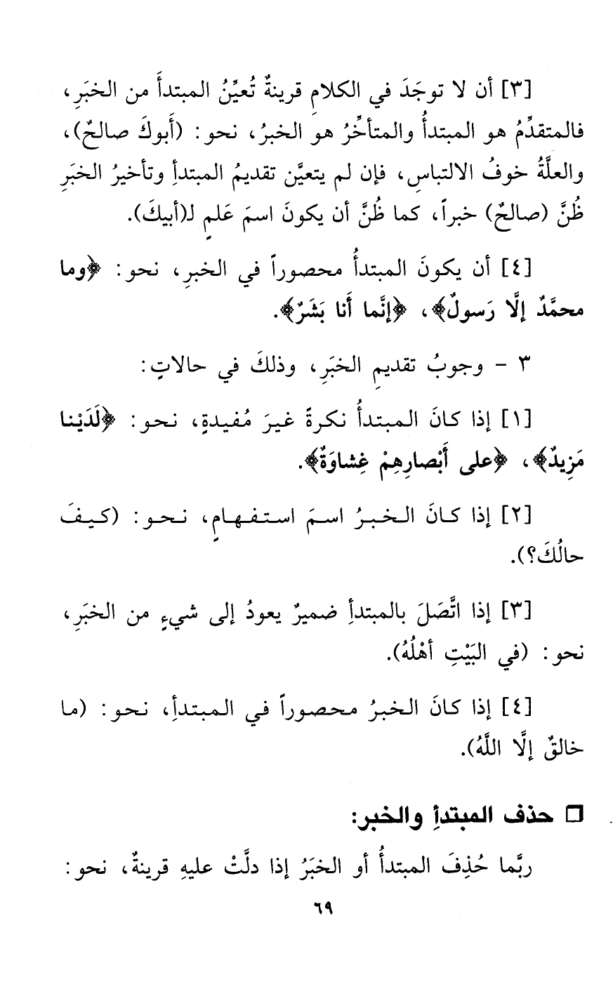 [4] إذا كانَ الخبرُ محصوراً في المبتدأِ، نحو: (ما خالقٌ إلَّا الله).