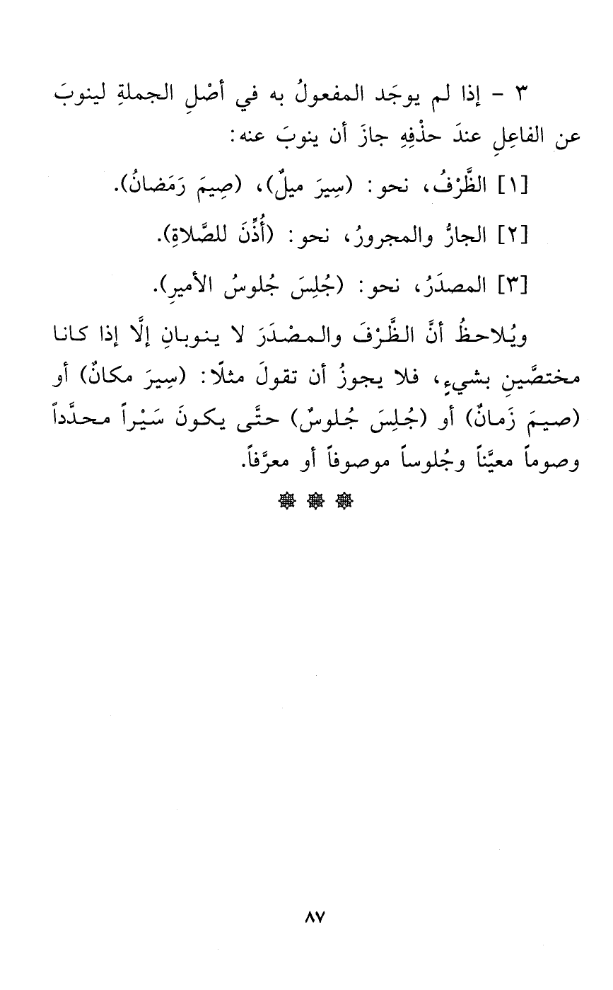 ويُلاحظُ أنَّ الظَّرْفَ والمصْدَرَ لا ينوبانِ إلَّا إذا كانا مختصَّينِ بشيءٍ، فلا يجوزُ أن تقولَ مثلاً: (سِيرَ مكانٌ) أو (صيمَ زَمانٌ) أو (جُلِسَ جُلوسٌ) حتَّى يكونَ سَيْراً محدَّداً وصوماً معيَّناً وجُلوساً موصوفاً أو معرَّفاً.