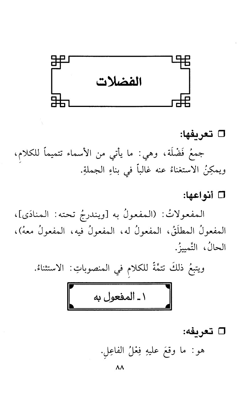 المفعولاتُ: (المفعولُ به [ويندرجُ تحته: المنادَى]، المفعولُ المطلَقُ، المفعولُ له، المفعولُ فيه، المفعولُ معهُ)، الحالُ، التَّمييزُ.