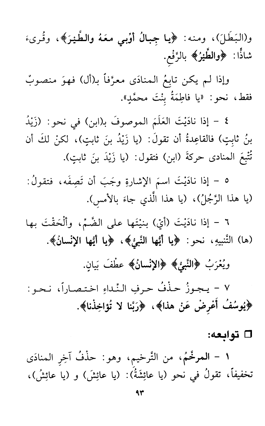 7 - يجوزُ حذْفُ حرفِ النِّداءِ اختصاراً، نحو: {يُوسُفُ أَعْرِضْ عَنْ هذا}، {رَبَّنا لا تُؤاخِذْنا}.