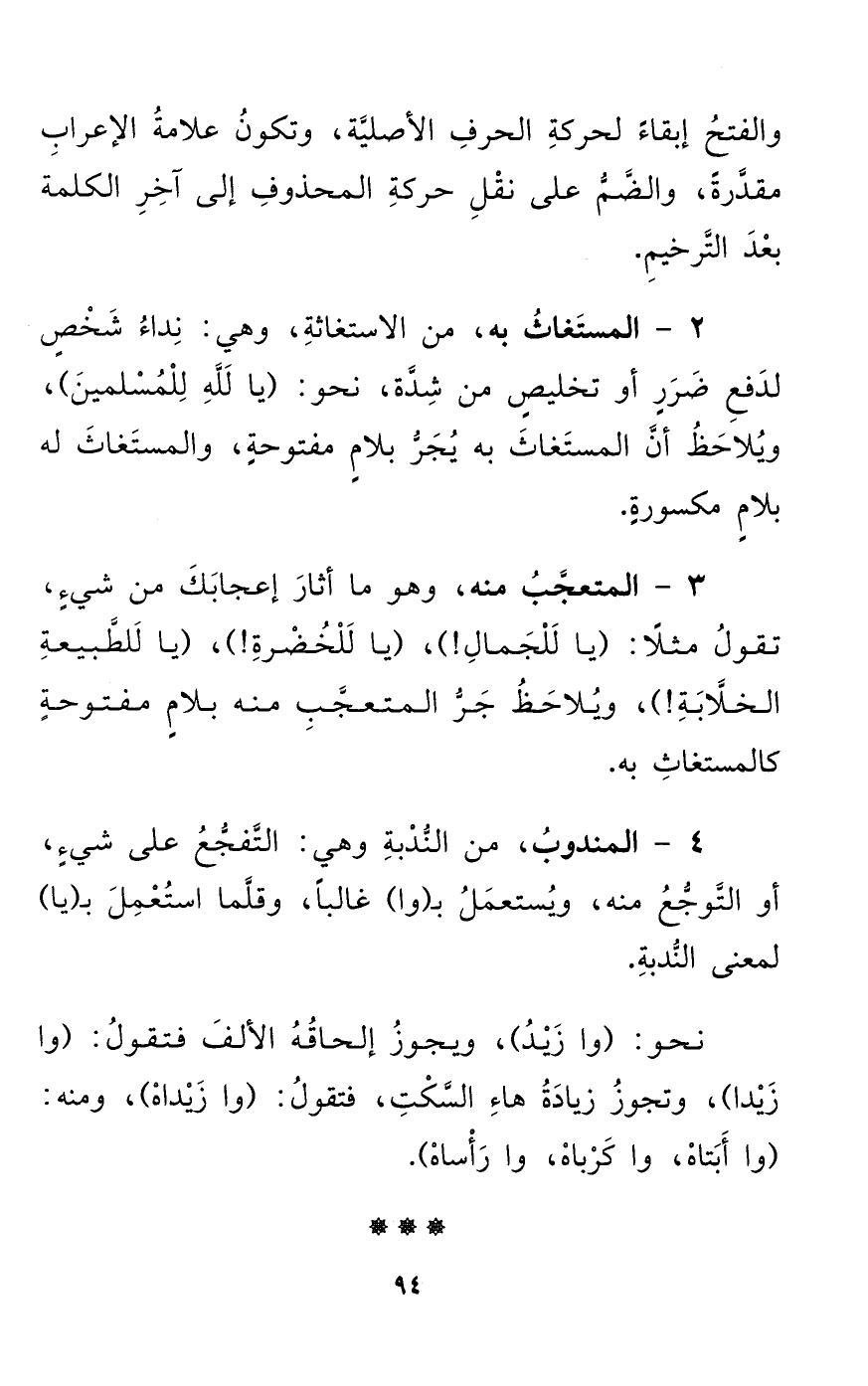 3 - المتعجَّبُ منه، وهو ما أثارَ إعجابَكَ من شيءٍ، تقولُ مثلاً: (يا لَلْجَمالِ!)، (يا لَلْخُضْرةِ!)، (يا لَلطَّبيعةِ الخلَّابَةِ!)، ويُلاحَظُ جَرُّ المتعجَّبِ منه بلامٍ مفتوحةٍ كالمستغاثِ به.