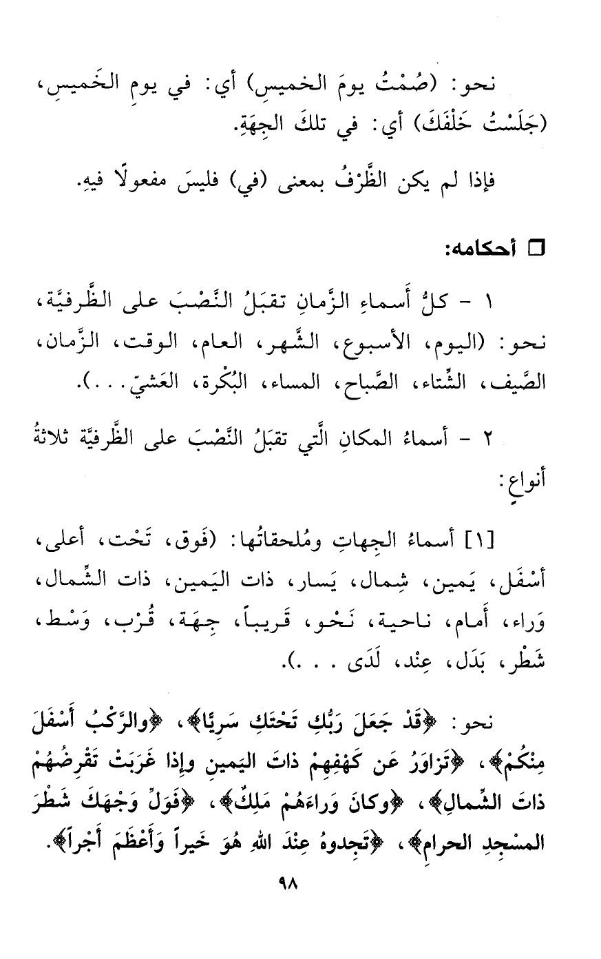 [1] أسماءُ الجِهاتِ ومُلحقاتُها: (فَوق، تَحْت، أعلى، أسْفَل، يَمين، شِمال، يَسار، ذات اليَمين، ذات الشِّمال، وَراء، أَمام، ناحية، نَحْو، قَريباً، جِهَة، قُرْب، وَسْط، شَطْر، بَدَل، عِنْد، لَدَى ...).