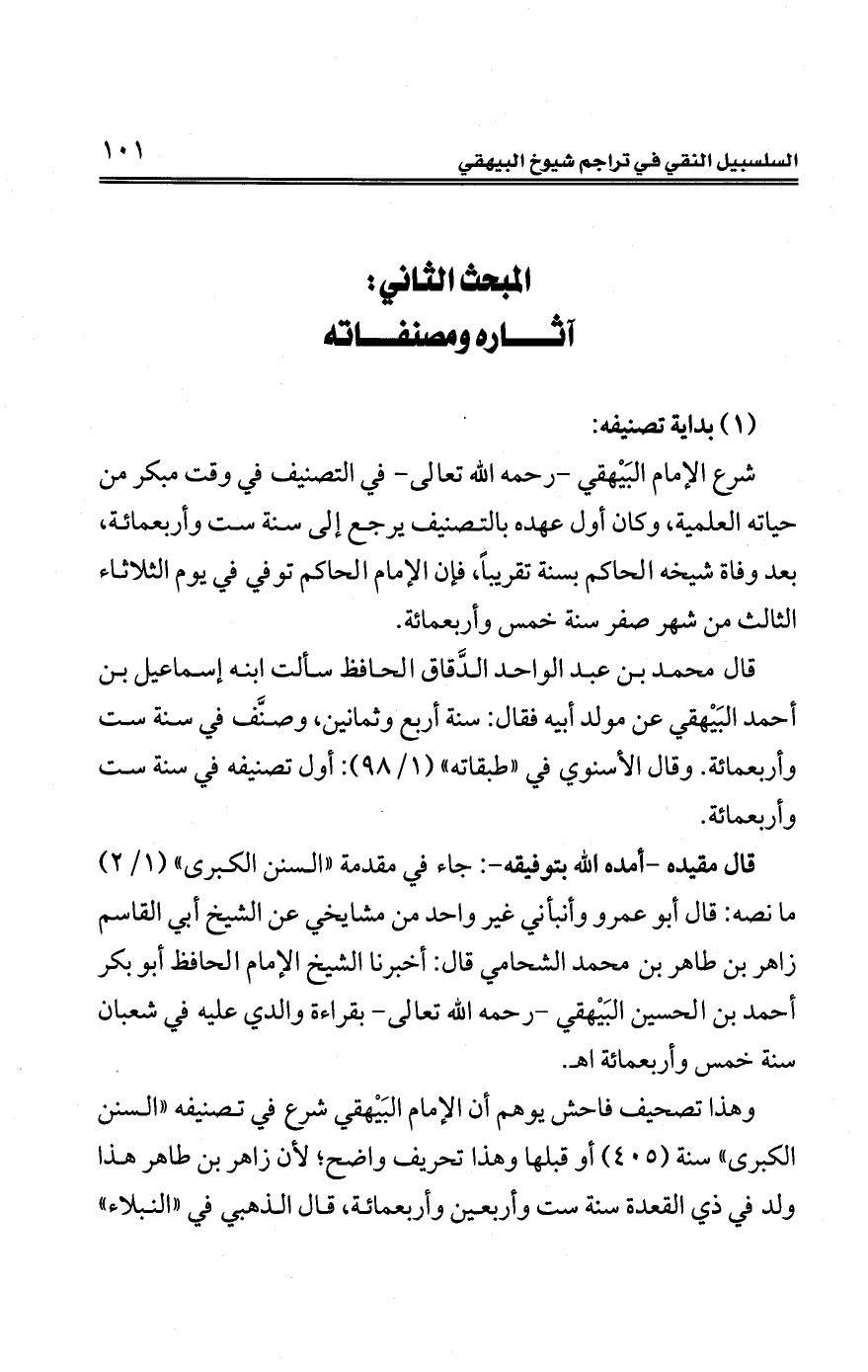 وهذا تصحيف فاحش يوهم أنّ الإمام البَيْهقي شرع في تصنيفه "السنن "الكبرى" سنة (405) أو قبلها وهذا تحريف واضح؛ لأنّ زاهر بن طاهر هذا ولد في ذي القعدة سنة ست وأربعين وأربعمائة، قال الذهبي في "النُّبَلاء"
