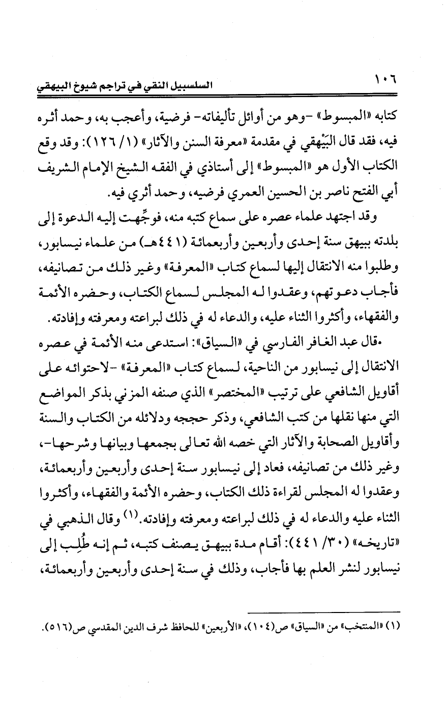 قال عبد الغافر الفارسي في "السياق": استدعى منه الأئمة في عصره الانتقال إلى نيسابور من الناحية، لسماع كتاب "المعرفة" - لاحتوائه على أقاويل الشّافعيّ على ترتيب "المختصر" الّذي صنفه المزني بذكر المواضع الّتي منها نقلها من كتب الشّافعيّ، وذكر حججه ودلائله من الكتاب والسُّنَّة وأقاويل الصّحابة والآثار الّتي خصه الله تعالي بجمعها وبيأنّها وشرحها -، وغير ذلك من تصانيفه، فعاد إلى نيسابور سنة إحدى وأربعين وأربعمائة، وعقدوا له المجلس لقراءة ذلك الكتاب، وحضره الأئمة والفقهاء، وأكثروا الثّناء عليه والدعاء له في ذلك لبراعته ومعرفته وإفادته. (¬1) وقال الذهبي في "تاريخه" (30/ 441): أقام مدة ببيهق يصنف كتبه، ثمّ إنّه طُلِب إلى نيسابور لنشر العلم بها فأجاب، وذلك في سنة إحدى وأربعين وأربعمائة،