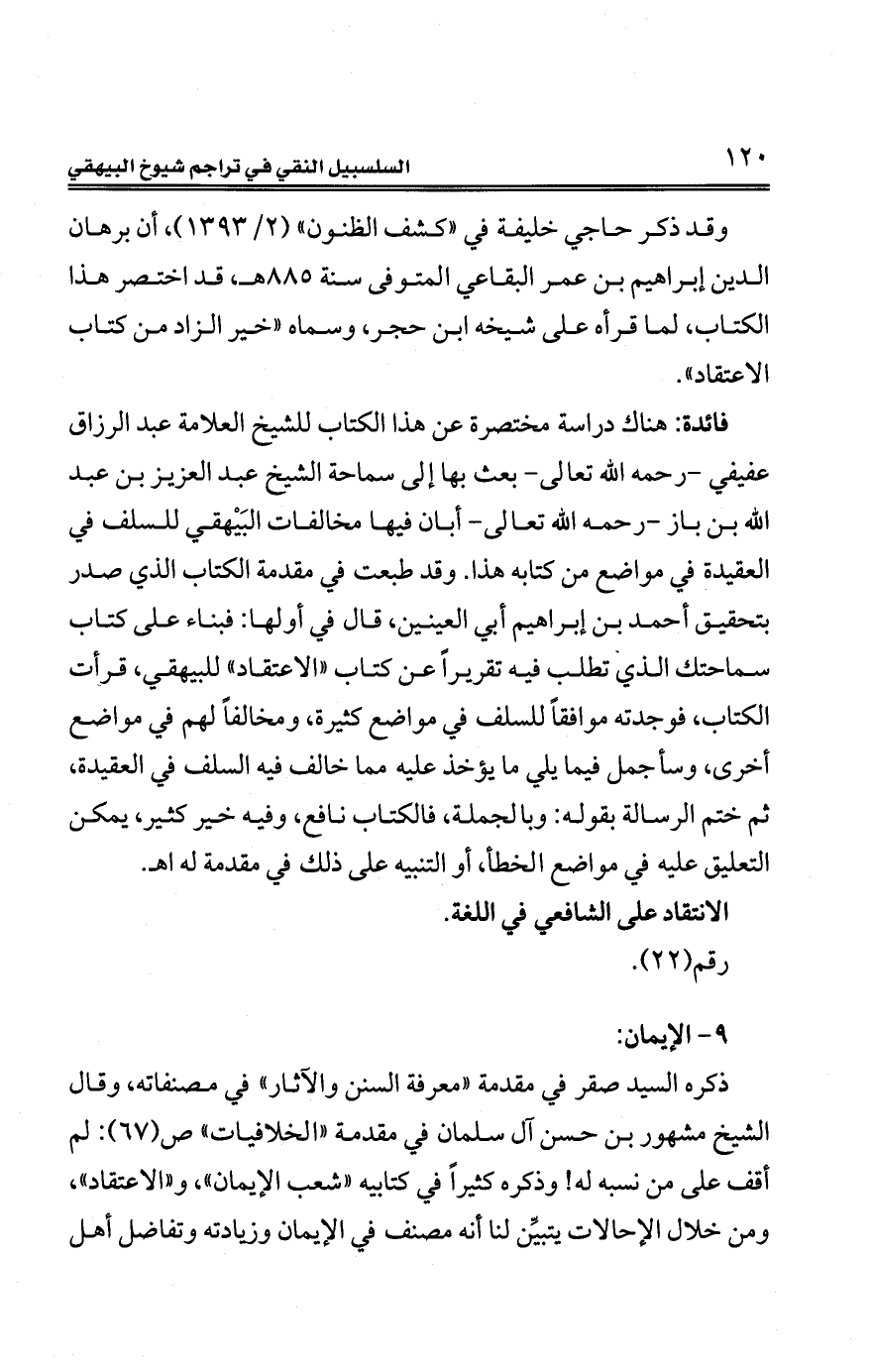 فائدة: هناك دراسة مختصرة عن هذا الكتاب للشيخ العلامة عبد الرزّاق عفيفي -رحمه الله تعالى- بعث بها إلى سماحة الشّيخ عبد العزيز بن عبد الله بن باز - رحمه الله تعالى- أبان فيها مخالفات البَيْهقي للسلف في العقيدة في مواضع من كتابه هذا. وقد طبعت في مقدمة الكتاب الّذي صدر بتحقيق أحمد بن إبراهيم أبي العينين، قال في أولها: فبناء على كتاب سماحتك الّذي تطلب فيه تقريرًا عن كتاب "الاعتقاد" للبيهقي، قرأت الكتاب، فوجدته موافقًا للسلف في مواضع كثيرة، ومخالفًا لهم في مواضع أخرى، وسأجمل فيما يلي ما يؤخذ عليه ممّا خالف فيه السلف في العقيدة، ثمّ ختم الرسالة بقوله: وبالجملة، فالكتاب نافع، وفيه خير كثير، يمكن التعليق عليه في مواضع الخطأ، أو التنبيه على ذلك في مقدمة له اهـ