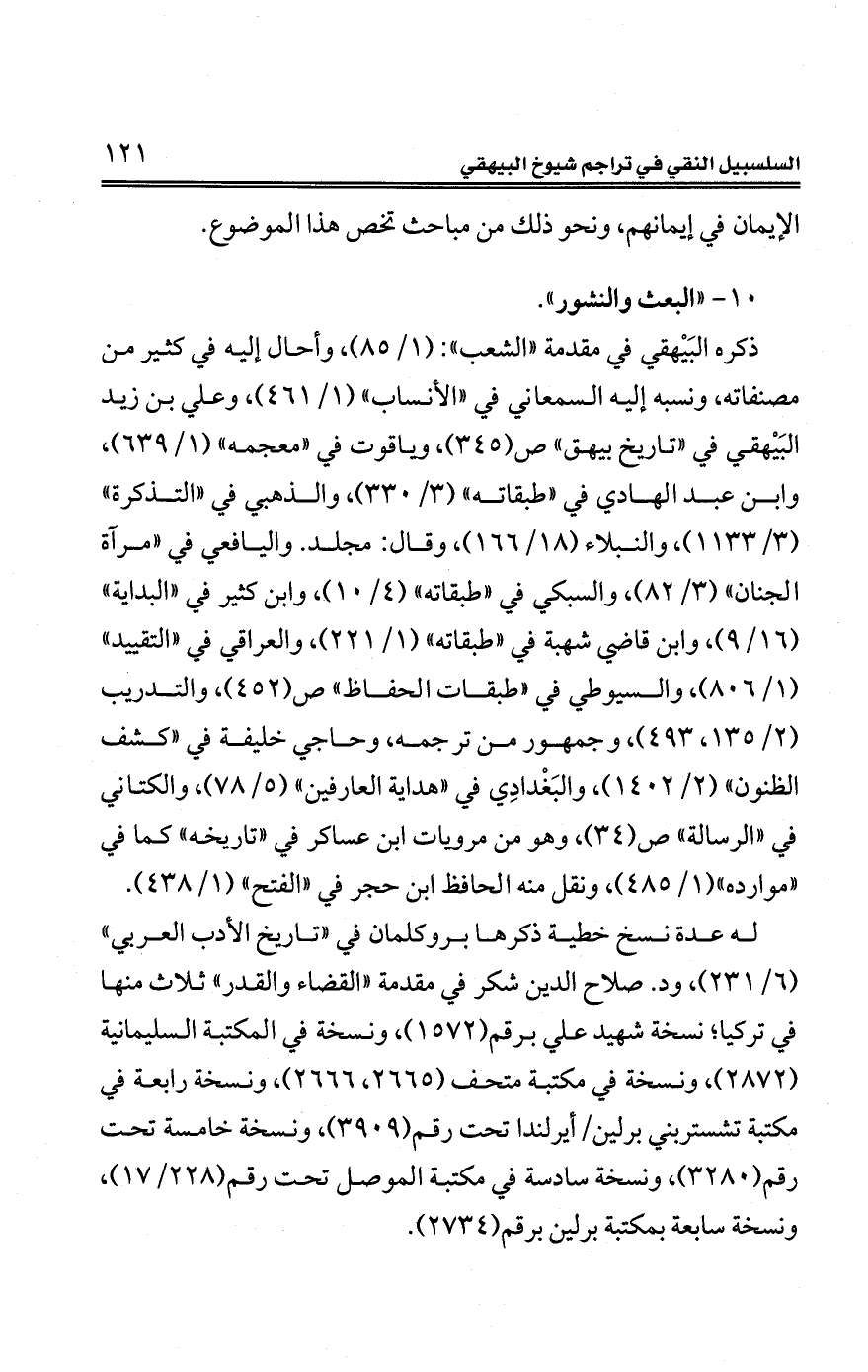 ذكره البَيْهقي في مقدمة "الشعب": (1/ 85)، وأحال إليه في كثير من مصنفاته، ونسبه إليه السمعاني في "الأنساب" (1/ 461)، وعلي بن زيد البَيْهقي في "تاريخ بيهق" ص (345)، وياقوت في "معجمه" (1/ 639)، وابن عبد الهادي في "طبقاته" (3/ 330)، والذهبي في "التذكرة" (3/ 1133)، والنبلاء (18/ 166)، وقال: مجلد. واليافعي في "مرآة الجنان" (3/ 82)، والسبكي في "طبقاته" (4/ 10)، وابن كثير في "البداية" (16/ 9)، وابن قاضي شهبة في "طبقاته" (1/ 221)، والعراقي في "التقييد" (1/ 806)، والسيوطي في "طبقات الحفاظ" ص (452)، والتدريب (2/ 135، 493)، وجمهور من ترجمه، وحاجي خليفة في "كشف الظنون" (2/ 1402)، والبَغْدادِي في "هداية العارفين" (5/ 78)، والكتاني في "الرسالة" ص (34)، وهو من مرويات ابن عساكر في "تاريخه" كما في "موارده" (1/ 485)، ونقل منه الحافظ ابن حجر في "الفتح" (1/ 438).