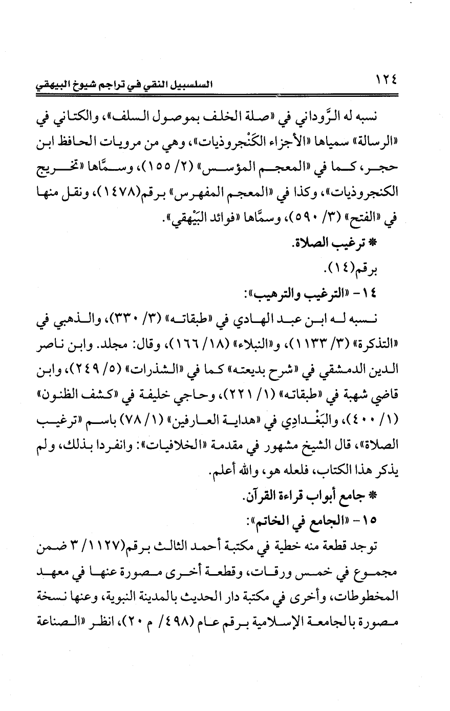 نسبه له ابن عبد الهادي في "طبقاته" (3/ 330)، والذهبي في "التذكرة" (3/ 1133)، و"النُّبَلاء" (18/ 166)، وقال: مجلد. وابن ناصر الدِّين الدمشقي في "شرح بديعته" كما في "الشذرات" (5/ 249)، وابن قاضي شهبة في "طبقاته" (1/ 221)، وحاجي خليفة في "كشف الظنون" (1/ 400)، والبَغْدادِي في "هداية العارفين" (1/ 78) باسم "ترغيب الصّلاة"، قال الشّيخ مشهور في مقدمة "الخلافيات": وانفردا بذلك، ولم يذكر هذا الكتاب، فلعله هو، والله أعلم.