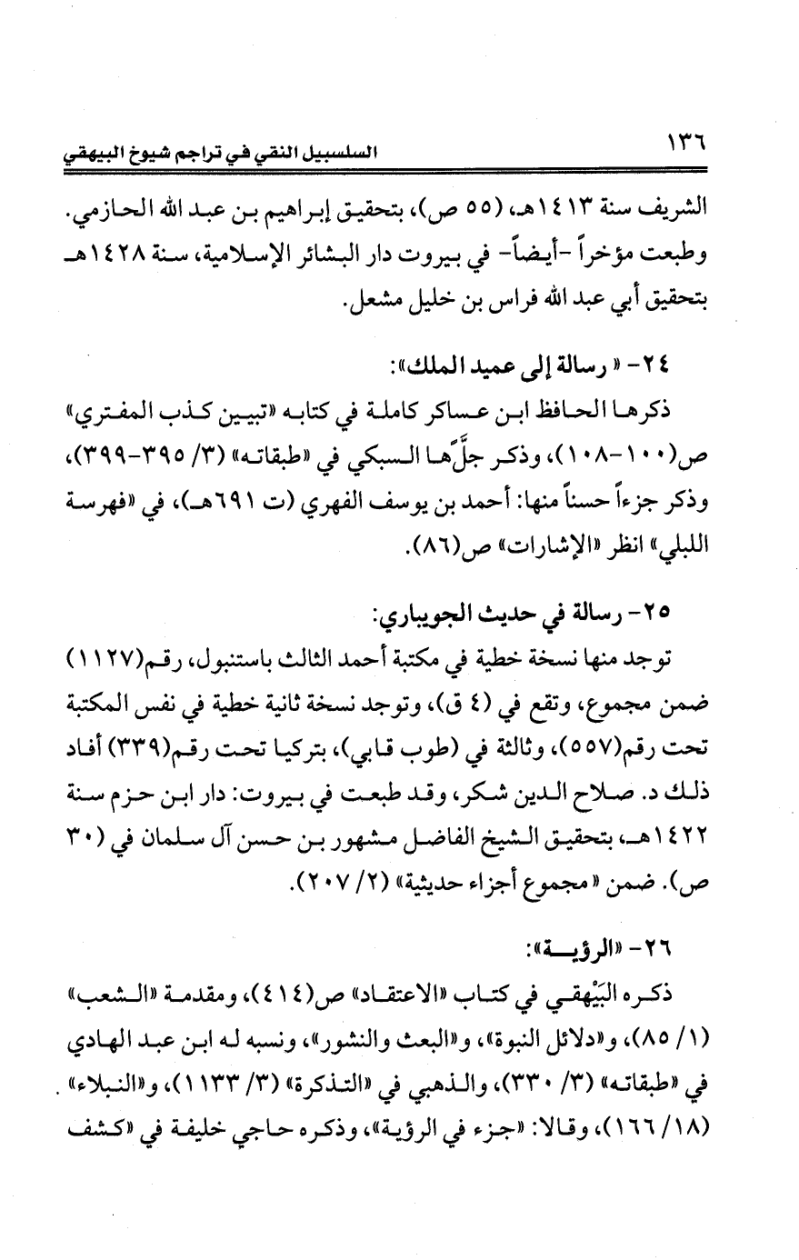 الشريف سنة 1413هـ, (55 ص)، بتحقيق إبراهيم بن عبد الله الحازمي. وطبعت مؤخرًا -أيضًا - في بيروت دار البشائر الإِسلامية، سنة 1428 هـ بتحقيق أبي عبد الله فراس بن خليل مشعل.