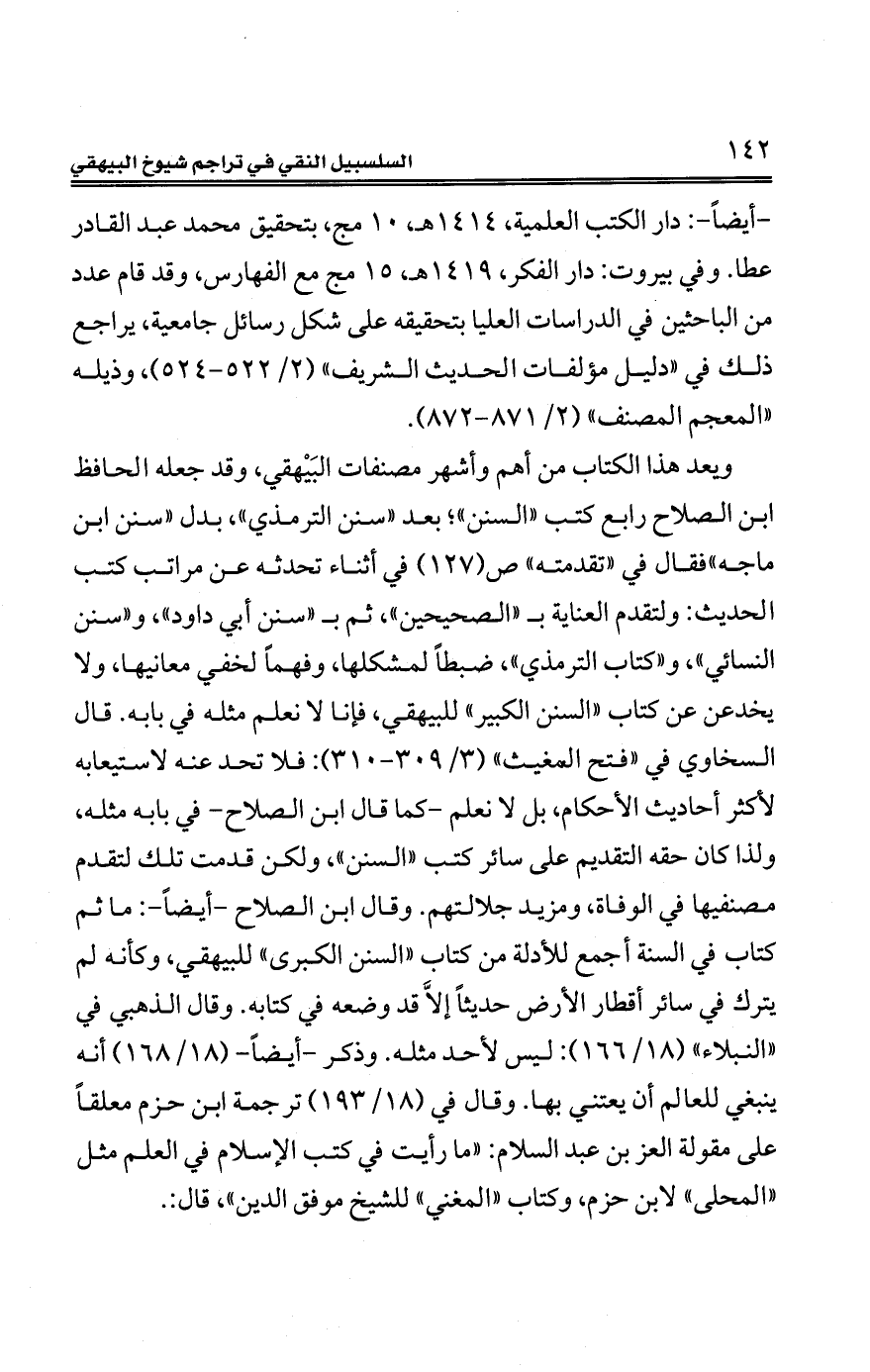 ويعد هذا الكتاب من أهم وأشهر مصنفات البَيْهقي، وقد جعله الحافظ ابن الصلاح رابع كتب "السنن"؛ بعد "سنن التّرمذيّ"، بدل "سنن ابن ماجه" فقال في "تقدمته" ص (127) في أثناء تحدثه عن مراتب كتب الحديث: ولتقدم العناية ب "الصحيحين"، ثمّ بـ"سنن أبي داود"، و"سنن النسائي"، و"كتاب التّرمذيّ"، ضبطًا لمشكلها، وفهمًا لخفي معانيها, ولا يخدعن عن كتاب "السنن الكبير" للبيهقي، فإنا لا نعلم مثله في بابه. قال السخاوي في "فتح المغيث" (3/ 309 - 310): فلا تحد عنه لاستيعابه لأكثر أحاديث الأحكام، بل لا نعلم -كما قال ابن الصلاح- في بابه مثله، ولذا كان حقه التقديم على سائر كتب "السنن"، ولكن قدمت تلك لتقدم مصنفيها في الوفاة، ومزيد جلالتهم. وقال ابن الصلاح -أيضًا -: ما ثمّ كتاب في السُّنَّة أجمع للأدلة من كتاب "السنن الكبرى" للبيهقي، وكأنّه لم يترك في سائر أقطار الأرض حديثًا إِلَّا قد وضعه في كتابه. وقال الذهبي في "النُّبَلاء" (18/ 166): ليس لأحد مثله. وذكر -أيضًا - (18/ 168) أنّه ينبغي للعالم أنّ يعتني بها. وقال في (18/ 193) ترجمة ابن حزم معلقًا على مقولة العز بن عبد السّلام: "ما رأيت في كتب الإسلام في العلم مثل "المحلى" لابن حزم، وكتاب "المغني" للشيخ موفق الدِّين"، قال:.
