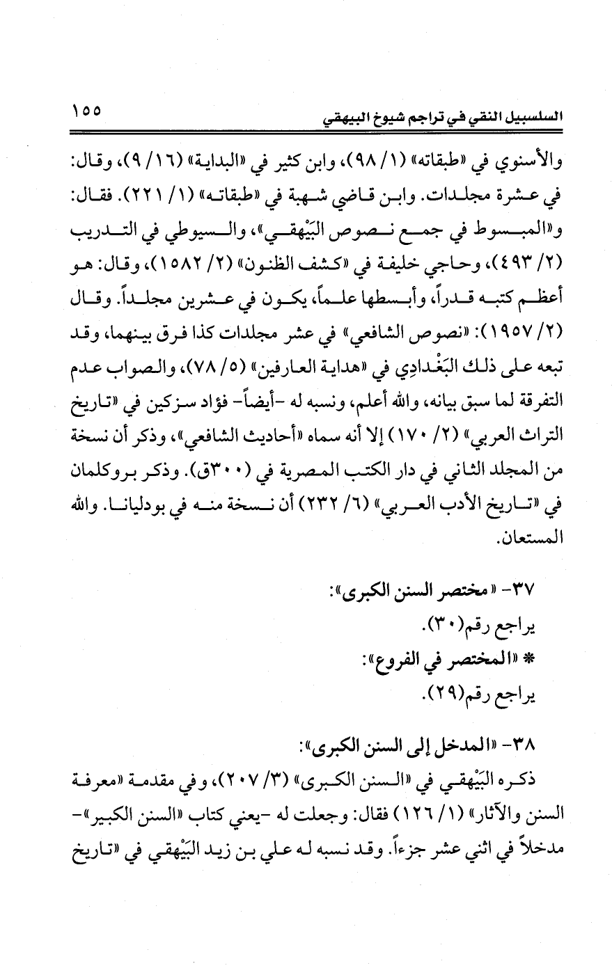 والإسنوي في "طبقاته" (1/ 98)، وابن كثير في "البداية" (16/ 9)، وقال: في عشرة مجلدات. وابن قاضي شهبة في "طبقاته" (1/ 221). فقال: و"المبسوط في جمع نصوص البَيْهقي"، والسيوطي في التدريب (2/ 493)، وحاجي خليفة في "كشف الظنون" (2/ 1582)، وقال: هو أعظم كتبه قدرًا، وأبسطها علمًا، يكون في عشرين مجلدًا. وقال (2/ 1957): "نصوص الشّافعيّ" في عشر مجلدات كذا فرق بينهما، وقد تبعه على ذلك البَغْدادِي في "هداية العارفين" (5/ 78)، والصواب عدم التفرقة لما سبق بيانه، والله أعلم، ونسبه له -أيضًا - فؤاد سزكين في "تاريخ التراث العربي" (2/ 170) إِلَّا أنّه سماه "أحاديث الشّافعيّ"، وذكر أنّ نسخة من المجلد الثّاني في دار الكتب المصرية في (300 ق). وذكر بروكلمان في "تاريخ الأدب العربي" (6/ 232) أنّ نسخة منه في بودليانا. والله المستعان.