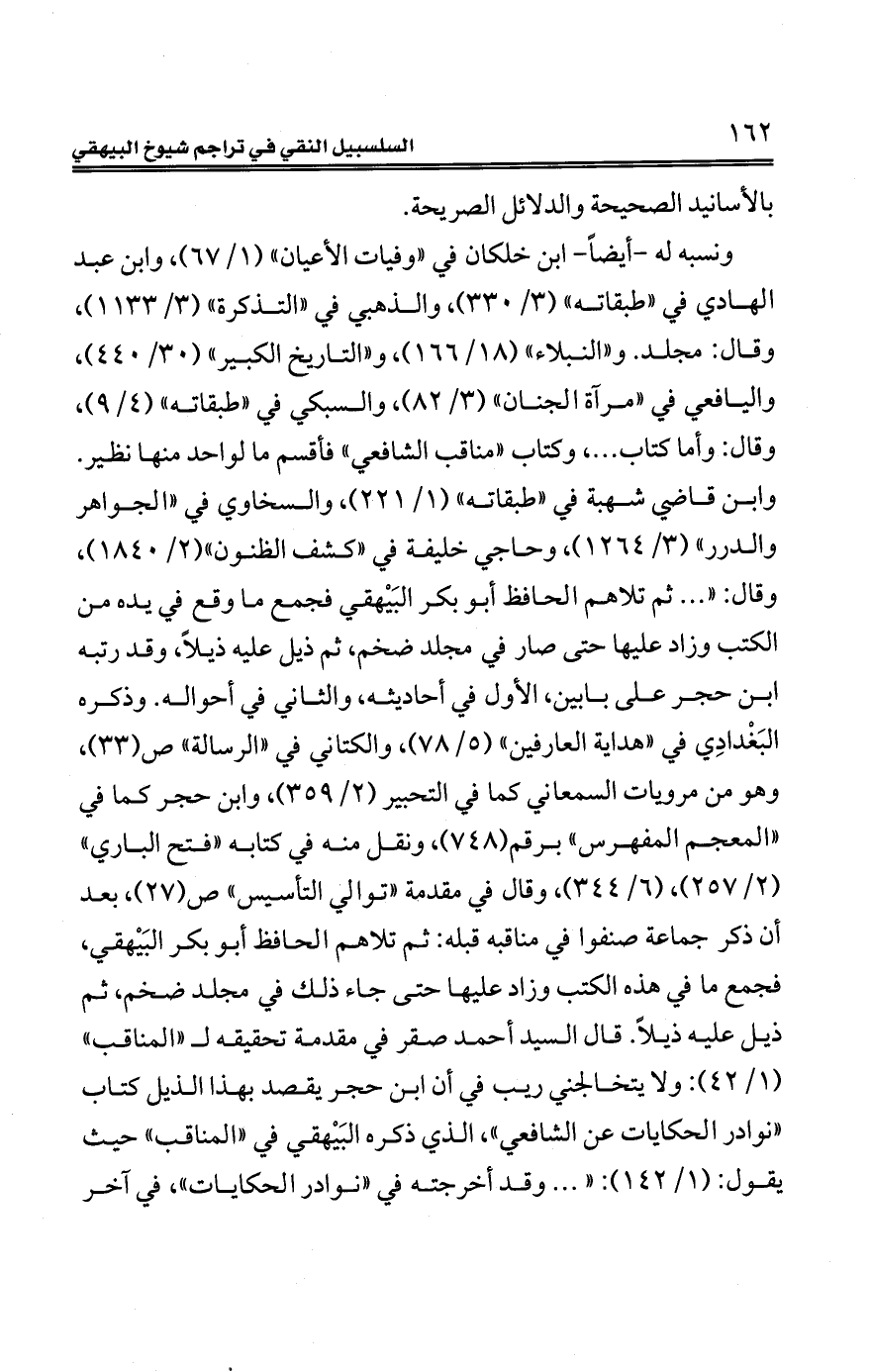 ونسبه له -أيضًا - ابن خلكان في "وفيات الأعيان" (1/ 67)، وابن عبد الهادي في "طبقاته" (3/ 330)، والذهبي في "التذكرة" (3/ 1133)، وقال: مجلد. و"النُّبَلاء" (18/ 166)، و"التاريخ الكبير" (30/ 440)، واليافعي في "مرآة الجنان" (3/ 82)، والسبكي في "طبقاته" (4/ 9)، وقال: وأمّا كتاب ... ، وكتاب "مناقب الشّافعيّ" فأقسم ما لواحد منها نظير. وابن قاضي شهبة في "طبقاته" (1/ 221)، والسخاوي في "الجواهر والدرر" (3/ 1264)، وحاجي خليفة في "كشف الظنون" (2/ 1840)، وقال: " ... ثمّ تلاهم الحافظ أبو بكر البَيْهقي فجمع ما وقع في يده من الكتب وزاد عليها حتّى صار في مجلد ضخم، ثمّ ذيل عليه ذيلًا، وقد رتبه ابن حجر على بابين، الأوّل في أحاديثه، والثّاني في أحواله. وذكره البَغْدادِي في "هداية العارفين" (5/ 78)، والكتاني في "الرسالة" ص (33)، وهو من مرويات السمعاني كما في التحبير (2/ 359)، وابن حجر كما في "المعجم المفهرس" برقم (748)، ونقل منه في كتابه "فتح الباري" (2/ 257)، (6/ 344)، وقال في مقدمة "توالي التأسيس" ص (27)، بعد أنّ ذكر جماعة صنفوا في مناقبه قبله: ثمّ تلاهم الحافظ أبو بكر البَيْهقي، فجمع ما في هذه الكتب وزاد عليها حتّى جاء ذلك في مجلد ضخم، ثمّ ذيل عليه ذيلًا. قال السَّيِّد أحمد صقر في مقدمة تحقيقه لـ "المناقب" (1/ 42): ولا يتخالجني ريب في أنّ ابن حجر يقصد بهذا الذيل كتاب "نوادر الحكايات عن الشّافعيّ"، الّذي ذكره البَيْهقي في "المناقب" حيث يقول: (1/ 142): " ... وقد أخرجته في "نوادر الحكايات"، في آخر