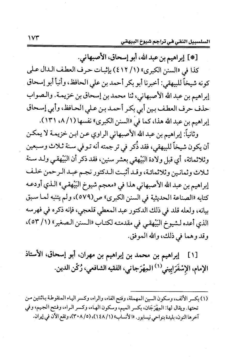 وثانيًا: إبراهيم بن عبد الله الأصبهاني الراوي عن ابن خزيمة لا يمكن أنّ يكون شيخًا للبيهقي، فقد ذُكر في ترجمته أنّه توفي سنة ثلاث وسبعين وثلاثمائة، أي قبل ولادة البَيْهقي بعشر سنين، فقد ذكر أنّ البَيْهقي ولد سنة ثلاث وثمانين وثلاثمائة وقد أثبت الدكتور نجم عبد الرّحمن خلف إبراهيم بن عبد الله الأصبهاني هذا في "معجم شيوخ البَيْهقي" الّذي أودعه كتابه "الصناعة الحديثية في السنن الكبرى" ص (579)، ولم يتنبه لما سبق بيانه، ولعله قلد في ذلك الدكتور عبد المعطي قلعجي، فإنّه ذكره في فهرسه الّذي أعده لشيوخ البَيْهقي في مقدمته لكتاب "السنن الصغير" (1/ 53)، وقد وهما في ذلك، والله الموفق.
