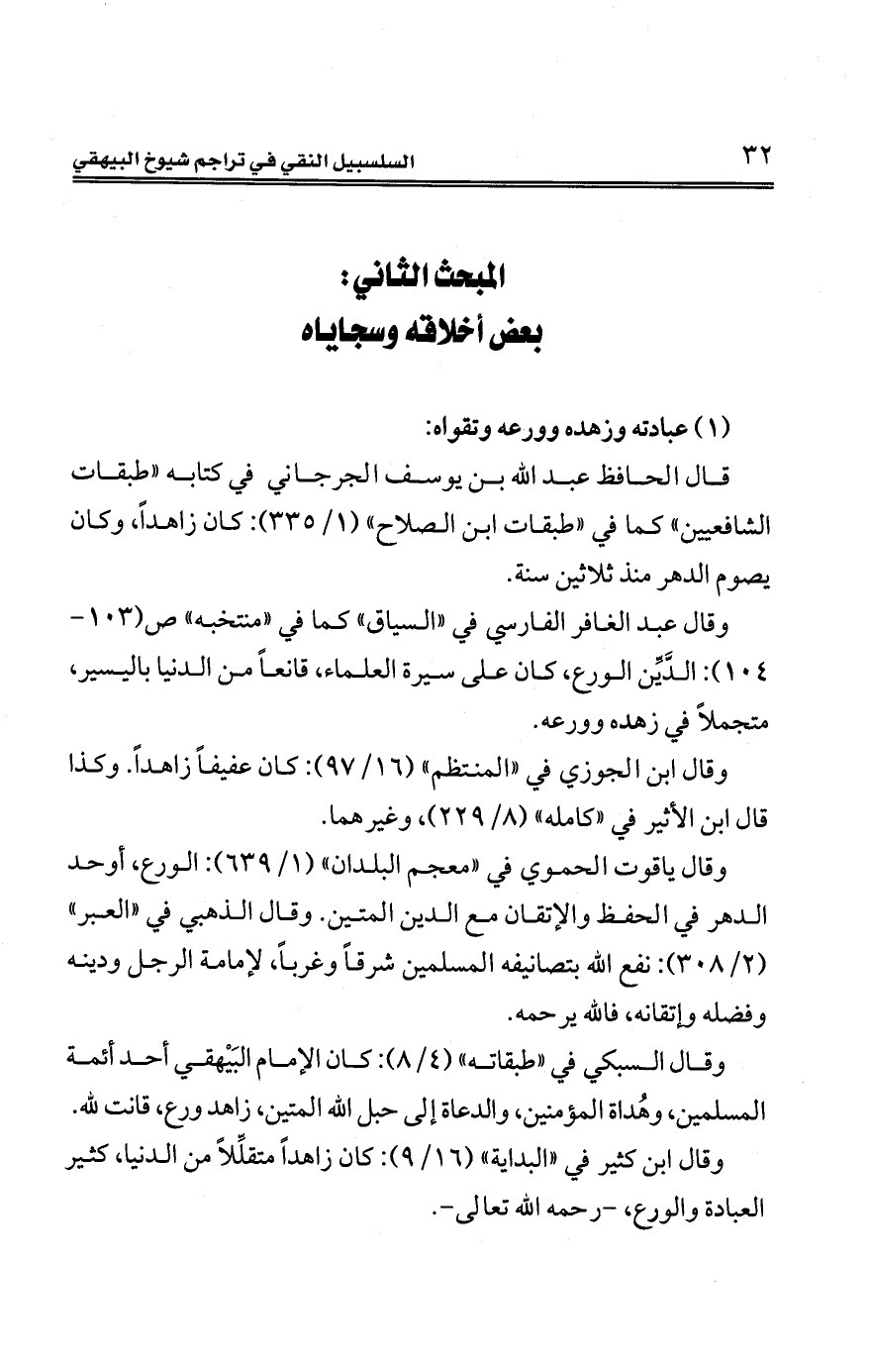 وقال السبكي في "طبقاته" (4/ 8): كان الإمام البَيْهقي أحد أئمة المسلمين، وهُداة المؤمنين، والدعاة إلى حبل الله المتين، زاهد ورع، قانت لله.