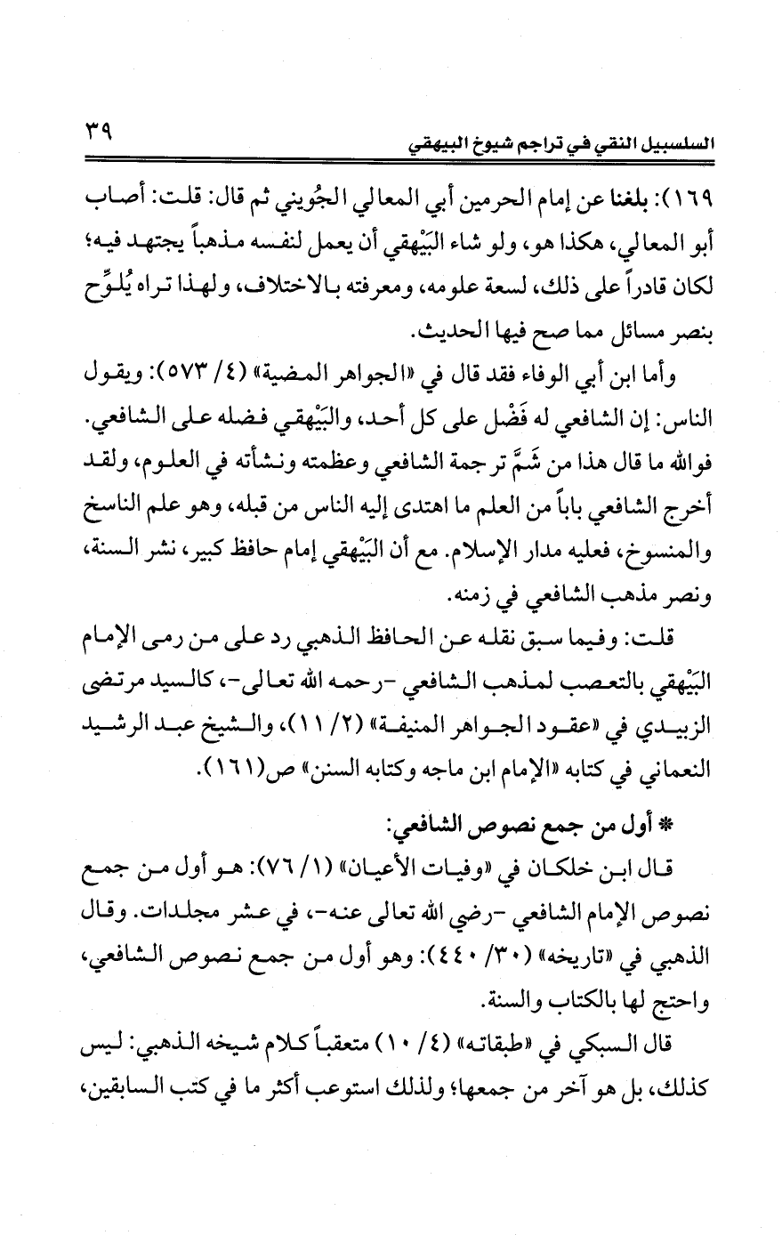 169): بلغنا عن إمام الحرمين أبي المعالي الجُويني ثمّ قال: قلت: أصاب أبو المعالي، هكذا هو، ولو شاء البَيْهقي أنّ يعمل لنفسه مذهبًا يجتهد فيه؛ لكان قادرًا على ذلك، لسعة علومه، ومعرفته بالاختلاف، ولهذا تراه يُلوِّح بنصر مسائل ممّا صح فيها الحديث.