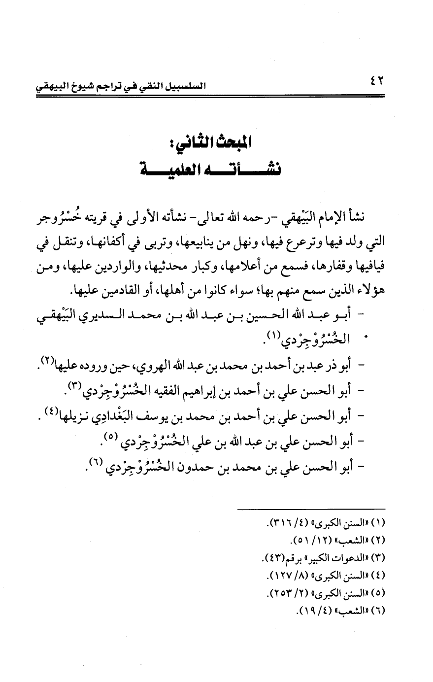 نشأ الإمام البَيْهقي -رحمه الله تعالي- نشأته الأولى في قريته خُسْرُوجر الّتي ولد فيها وترعرع فيها، ونهل من ينابيعها، وتربى في أكفأنّها، وتنقل في فيافيها وقفارها، فسمع من أعلامها، وكبار محدثيها، والواردين عليها، ومن هؤلاء الذين سمع منهم بها؛ سواء كانوا من أهلها، أو القادمين عليها.