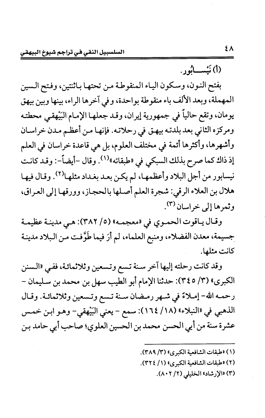 بفتح النون، وسكون الياء المنقوطة من تحتها باثنتين، وفتح السين المهملة، وبعد الألف جاء منقوطة بواحدة، وفي آخرها الراء، بينها وبين بيهق يومان، وتقع حاليًا في جمهورية إيران، وقد جعلها الإمام البَيْهقي محطته ومركزه الثّاني بعد بلدته بيهق في رحلاته. فإنها من أعظم مدن خراسان وأشهرها، وأكثرها أئمة في مختلف العلوم، بل هي قاعدة خراسان في العلم إذ ذاك كما صرح بذلك السبكي في "طبقاته" (¬1) وقال -أيضًا -: وقد كانت نيسابور من أجل البلاد وأعظمها, لم يكن بعد بغداد مثلها (¬2). وقال فيها هلال بن العلّاء الرقي: شجرة العلم أصلها بالحجاز، وورقها إلى العراق، وثمرها إلى خراسان (¬3).