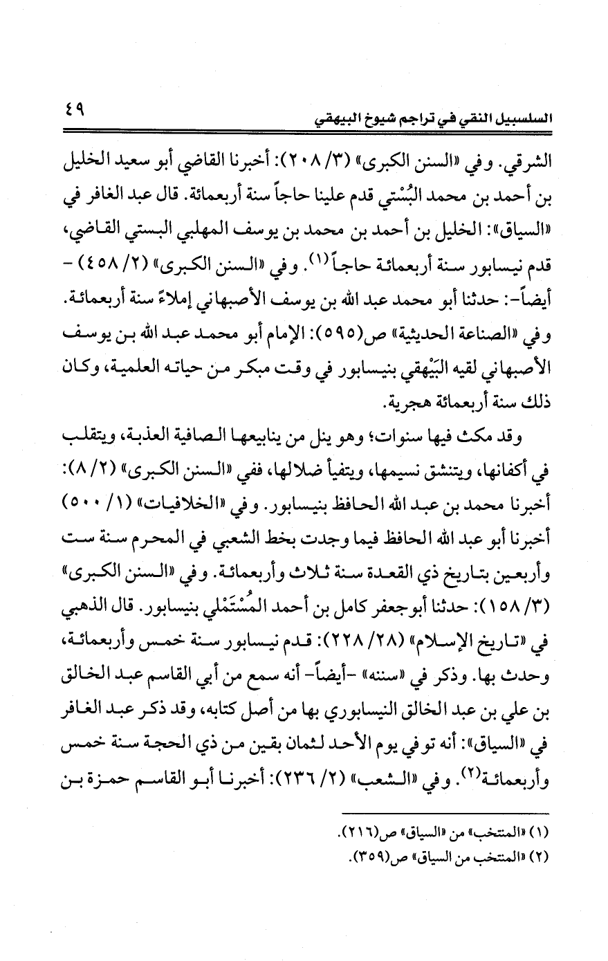 الشرقي. وفي "السنن الكبرى" (3/ 208): أخبرنا القاضي أبو سعيد الخليل بن أحمد بن محمَّد البُسْتي قدم علينا حاجًا سنة أربعمائة. قال عبد الغافر في "السياق": الخليل بن أحمد بن محمَّد بن يوسف المهلبي البستي القاضي، قدم نيسابور سنة أربعمائة حاجًا (¬1). وفي "السنن الكبرى" (2/ 458) - أيضًا -: حدّثنا أبو محمَّد عبد الله بن يوسف الأصبهاني إملاءً سنة أربعمائة. وفي "الصناعة الحديثية" ص (595): الإمام أبو محمَّد عبد الله بن يوسف الأصبهاني لقيه البَيْهقي بنيسابور في وقت مبكر من حياته العلمية، وكان ذلك سنة أربعمائة هجرية.