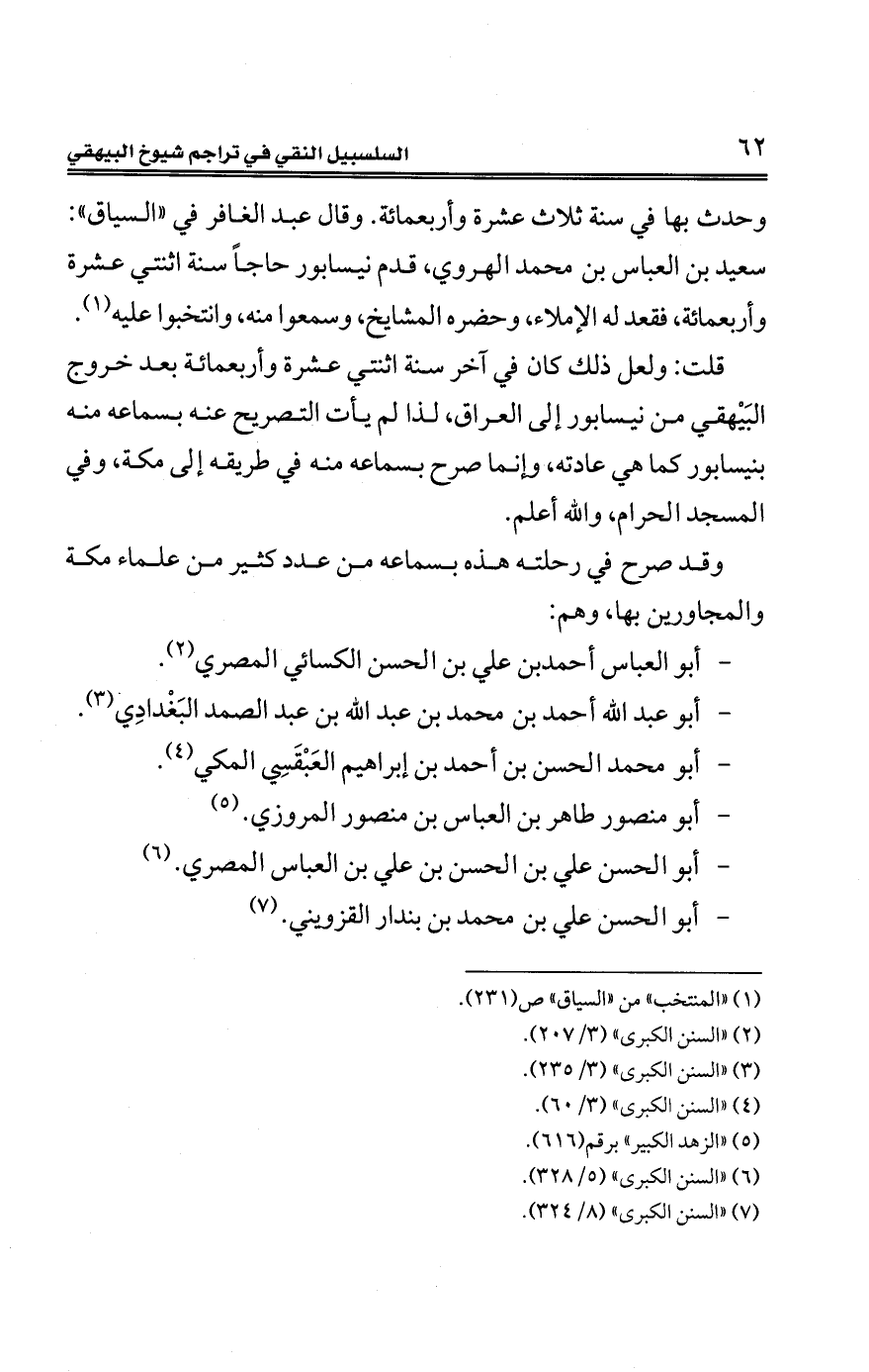 قلت: ولعلّ ذلك كان في آخر سنة اثنتي عشرة وأربعمائة بعد خروج البَيْهقي من نيسابور إلى العراق، لذا لم يأت التصريح عنه بسماعه منه بنيسابور كما هي عادته، وإنّما صرح بسماعه منه في طريقه إلى مكّة، وفي المسجد الحرام، والله أعلم.