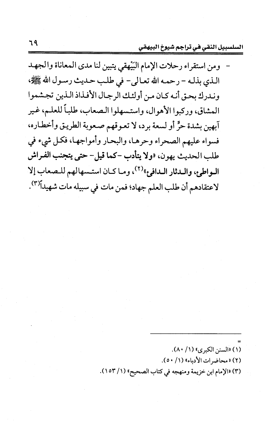 - ومن استقراء رحلات الإمام البَيْهقي يتبين لنا مدى المعاناة والجهد الّذي بذله -رحمه الله تعالي- في طلب حديث رسول الله - صلّى الله عليه وسلم -, وندرك بحق أنّه كان من أولئك الرجال الأفذاذ الذين تجشموا المشاق، وركبوا الأهوال، واستسهلوا الصعاب، طلبًا للعلم، غير آبهين بمثل دة حرٍّ أو لسعة برد، لا تعوقهم صعوبة الطريق وأخطاره، فسواء عليهم الصحراء وحرها، والبحار وأمواجها، فكل شيءٍ في طلب الحديث يهون، "ولا يتأدب -كما قيل- حتّى يتجنب الفراش الواطئ، والدثار الدافئ" (¬1)، وما كان استسها لهم للصعاب إِلَّا لاعتقادهم أنّ طلب العلم جهاد؛ فمن مات في سبيله مات شهيدًا (¬2).