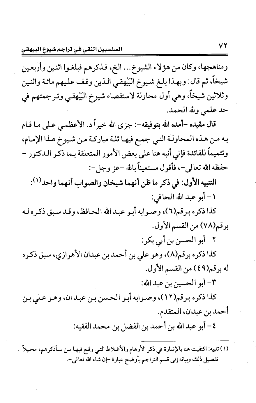 ومناهجها، وكان من هؤلاء الشيوخ ... الخ، فذكرهم فبلغوا اثنين وأربعين شيخًا، ثمّ قال: وبهذا بلغ شيوخ البَيْهقي الذين وقف عليهم مائة واثنين وثلاثين شيخًا، وهي أول محاولة لاستقصاء شيوخ البَيْهقي وترجمتهم في حد علمي ولله الحمد.