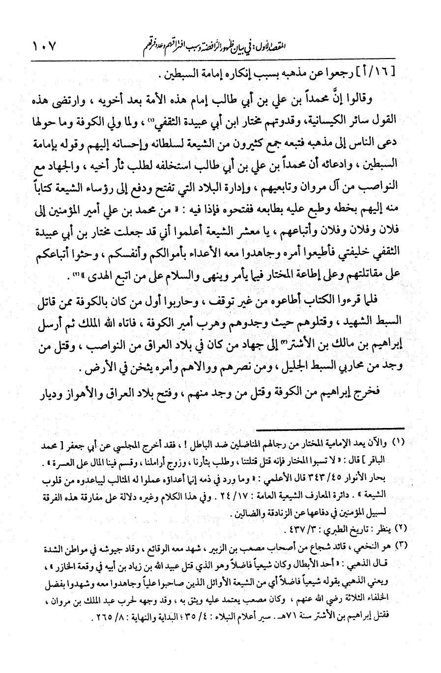 رجعوا عن مذهبه بسبب إنكاره إمامة السبطين. وقالوا إن محمد بن علي بن أبي طالب إمام هذه الأمة بعد أخويه. وارتضى هذا القول سائر الكيسانية، وقدوتهم مختار بن أبي عبيد الثقفي. ولما ولي الكوفة وما حولها دعى الناس إلى مذهبه فتبعه جمع كثيرون من الشيعة لسلطانه وإحسانه إليهم وقوله بإمامة السبطين وادعائه أن محمد بن علي بن أبي طالب استخلفه لطلب ثأر أخيه والجهاد مع النواصب من آل مروان وتابعيهم وإدارة البلاد التي تفتح. ودفع إلى رؤساء الشيعة كتابا منه إليهم بخطه وطبع عليه بطابعه فإذا فيه: "من محمد بن علي أمير المؤمنين إلى فلان وفلان وفلان وأتباعهم، يا معشر الشيعة اعلموا أني قد جعلت مختار بن أبي عبيد الثقفي خليفتي، فأطيعوا أمره وجاهدوا معه الأعداء بأموالكم وأنفسكم وحثوا أتباعكم على مقاتلتهم وعلى إطاعة المختار فيما يأمر وينهى، والسلام على من اتبع الهدى". فلما قرأوا الكتاب أطاعوه من غير توقف. وحاربوا أول من كان بالكوفة ممن قاتل السبط الشهيد وقتلوهم حيث وجدوهم، وهرب أمير الكوفة، فآتاه الله الملك. ثم أرسل إبراهيم بن مالك بن الأشتر إلى جهاد من كان في بلاد العراق من النواصب وقتل من وجد من محاربي السبط الجليل ومن نصرهم ووالاهم، وأمره [بأن] يثخن في الأرض. فخرج إبراهيم من الكوفة وقتل من وجد منهم، وفتح بلاد العراق والأهواز وديار