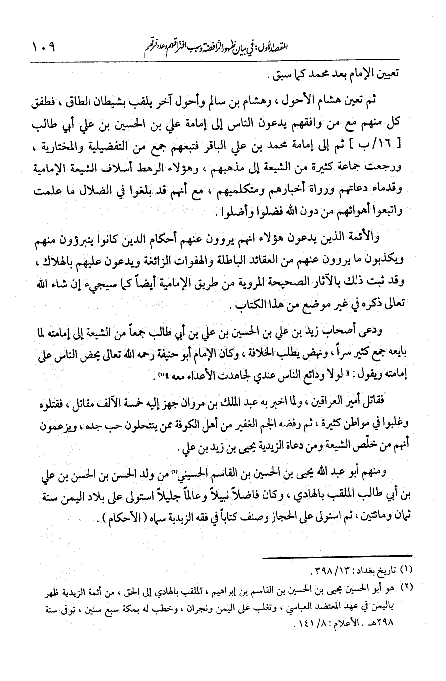 ثم تعين هشام الأحول وهشام بن سالم وأحول آخر يلقب بشيطان الطاق. فطفق كل منهم مع من وافقهم يدعون الناس إلى إمامة علي بن الحسين بن علي بن أبي طالب، ثم إلى إمامة محمد بن علي الباقر. فتبعهم جمع من التفضيلية والمختارية، ورجعت جماعة كثيرة من الشيعة إلى مذهبهم. وهؤلاء الرهط أسلاف الشيعة الإمامية وقدماء دعاتهم ورواة أخبارهم ومتكلميهم، مع أنهم قد بلغوا في الضلال ما علمت واتبعوا أهواءهم من دون الله فضلوا وأضلوا. والأئمة الذين يدعون هؤلاء أنهم يروون عنهم أحكام الدين كانوا يتبرؤون منهم ويكذبون ما يروون عنهم من العقائد الباطلة والهفوات الزائغة ويدعون عليهم بالهلاك. وقد ثبت ذلك بالآثار الصحيحة المروية من طريق الإمامية أيضا كما سيجيء إن شاء الله تعالى ذكره في غير موضع من هذا الكتاب.