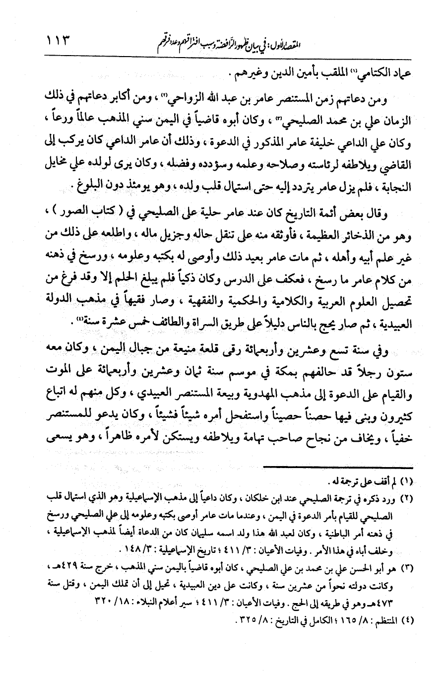 وقال بعض أئمة التاريخ كان عند عامر حلية علي الصليحي في كتاب الصور، وهو من الذخائر العظيمة، فأوثقه منه على تنقل حاله وجزيل ماله وأطلعه على ذلك من غير علم أبيه وأهله، ثم مات عامر بعيد ذلك وأوصى له بكتبه وعلومه ورسخ في ذهنه من كلام عامر ما رسخ، فعكف على الدرس وكان ذكيا، فلم يبلغ الحلم إلا وقد فرغ من تحصيل العلوم العربية والكلامية والحكمية والفقهية، وصار فقيها في مذهب الدولة العبيدية، ثم صار يحج بالناس دليلا على طريق السراة والطائف خمس عشرة سنة. وفي سنة تسع وعشرين وأربعمائة رقى قلعة منيعة من جبال اليمن، وكان معه ستون رجلا قد حالفهم بمكة في موسم سنة ثمان وعشرين وأربعمائة على الموت والقيام على الدعوة إلى مذهب المهدوية وبيعة المستنصر العبيدي، وكل منهم له أتباع كثيرون. وبنى فيها حصنا حصينا واستفحل أمره شيئا فشيئا. وكان يدعو للمستنصر خفيا ويخاف من نجاح صاحب تهامة ويلاطفه ويستكن لأمره ظاهرا وهو يسعى