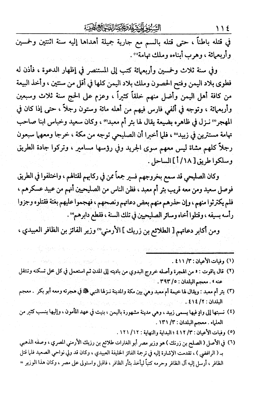 في قتله باطنا، حتى قتله بالسم مع جارية جميلة أهداها إليه سنة اثنتين وخمسين وأربعمائة، وهرب أبناؤه، وملك تهامة. وفي سنة ثلاث وخمسين وأربعمائة كتب إلى المستنصر في إظهار الدعوة، فأذن له. فطوى بلاد اليمن وفتح الحصون وملك بلاد اليمن كلها في أقل من سنتين، وأخذ البيعة من كافة أهل اليمن وأضل منهم خلقا كثيرا. وعزم على الحج سنة ثلاث وسبعين وأربعمائة، وتوجه في ألفي فارس فيهم من أهله مائة وستون رجلا، حتى إذا كان في النهجر نزل في ظاهره بضيعة يقال لها بئر أم معبد، وكان سعيد وخباس ابنا صاحب تهامة مستترين في زبيد، فلما أخبرا أن الصليحي توجه من مكة خرجا ومعهما سبعون رجلا كلهم مشاة ليس معهم سوى الجريد وفي رؤسها مسامير، وتركوا جادة الطريق وسلكوا طريق الساحل. وكان الصليحي قد سمع بخروجهم فسير جمعا ممن في ركابهم لقتالهم، واختلفوا في الطريق فوصل سعيد ومن معه قريب بئر أم معبد، فظن الناس من الصليحيين أنهم من عبيد عسكرهم فلم يكترثوا منهم، وإن حذرهم منهم بعض دعاتهم ونصحهم، فهجموا عليهم بغتة فقتلوه وجزوا رأسه بسيفه وقتلوا أخاه وسائر الصليحيين في تلك السنة فقطع دابرهم.