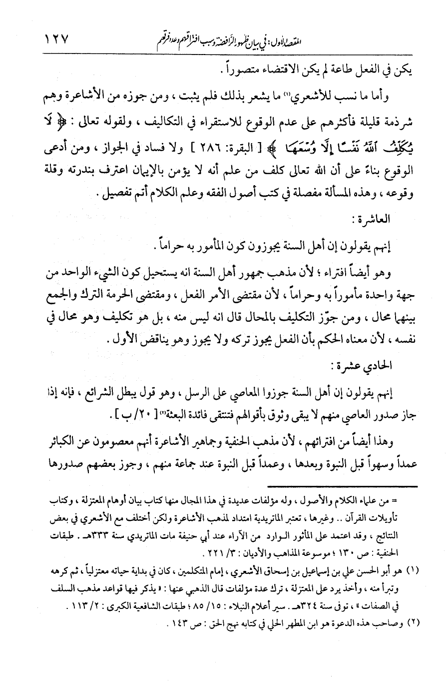 الحادية عشرة: إنهم يقولون إن أهل السنة جوزوا المعاصي على الرسل، وهو قول يبطل الشرائع، فإنه إذا جاز صدور المعاصي منهم لا يبقى وثوق بأقوالهم فتنتفي فائدة البعثة.