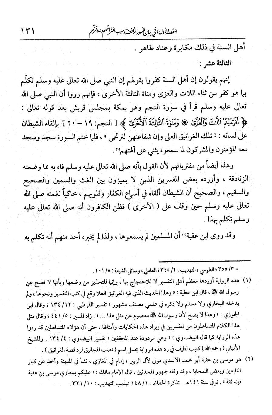 الثالثة عشر: إنهم يقولون إن أهل السنة كفروا بقولهم إن النبي - صلى الله عليه وسلم - تكلم بما هو كفر من ثناء اللات والعزى ومناة الثالثة الأخرى، فإنهم رووا أن النبي - صلى الله عليه وسلم - قرأ في سورة النجم وهو بمكة بمجلس قريش بعد قوله تعالى: {أَفَرَأَيْتُمُ اللَّاتَ وَالْعُزَّى * وَمَنَاةَ الثَّالِثَةَ الْأُخْرَى}، بإلقاء الشيطان على لسانه: "تلك الغرانيق العلى وإن شفاعتهن لترتجى"، فلما ختم السورة سجد وسجد معه المؤمنون والمشركون لما سمعوه يثني على آلهتهم.