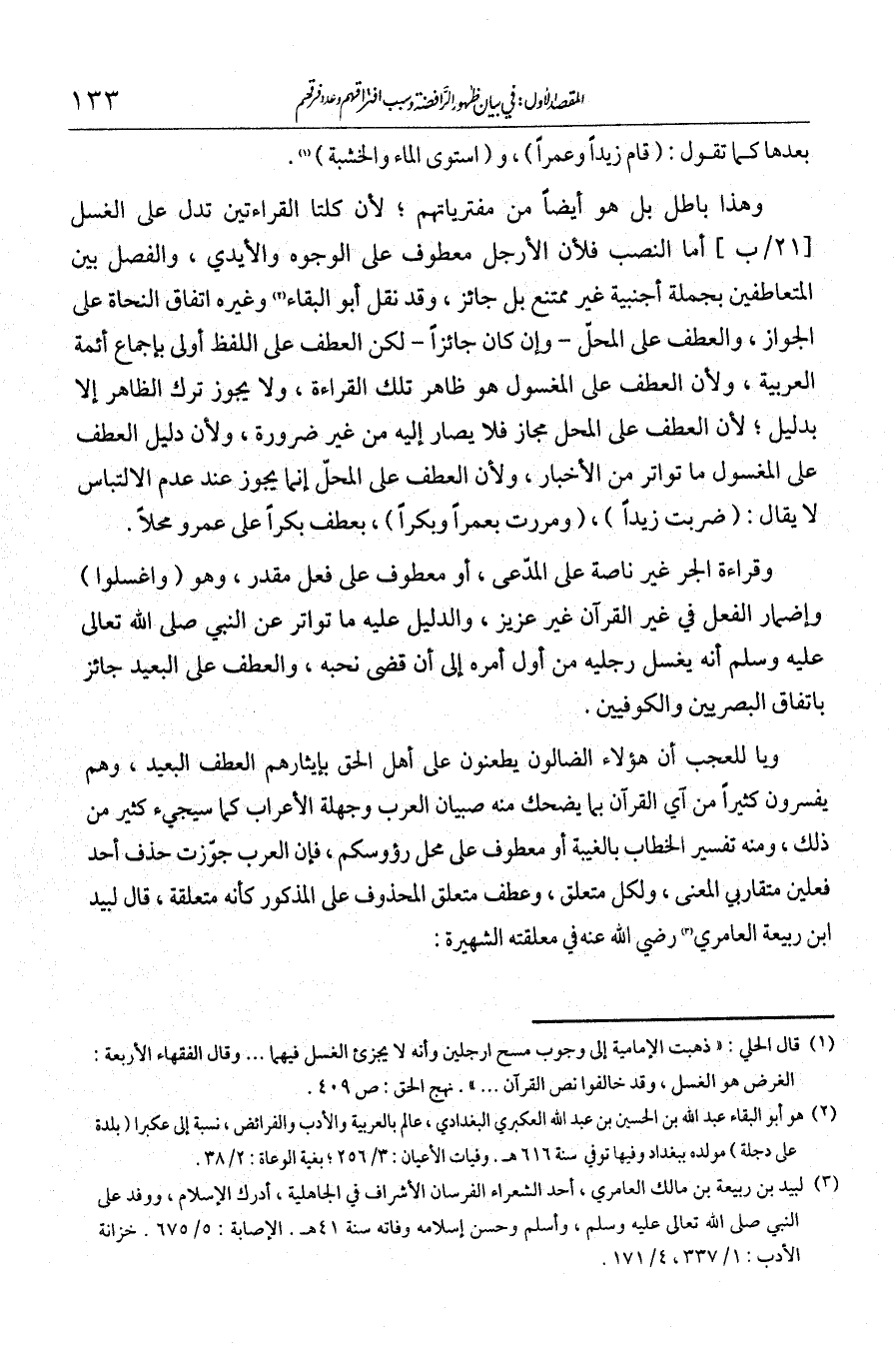 وهذا باطل بل هو أيضا من مفترياتهم، لأن كلتا القراءتين تدل على الغسل. أما النصب فلأن الأرجل معطوف على الوجوه والأيدي، والفصل بين المتعاطفين بجملة أجنبية غير ممتنع بل جائز، وقد نقل أبو البقاء وغيره اتفاق النحاة على الجواز، والعطف على المحل -وإن كان جائزا- لكن العطف على اللفظ أولى بإجماع أئمة العربية، ولأن العطف على المغسول هو ظاهر تلك القراءة، ولا يجوز ترك الظاهر إلا بدليل، لأن العطف على المحل مجاز فلا يصار إليه من غير ضرورة، ولأن دليل العطف على المغسول ما تواتر من الأخبار، ولأن العطف على المحل إنما يجوز عند عدم الالتباس لا يقال: "ضربت زيدا ومررت بعمرو وبكرا"، بعطف بكرا على عمرو محلا. وقراءة الجر غير خاصة على المدعى. أو معطوف على فعل مقدر، وهو {فَاغْسِلُوا} واضمار الفعل في غير القرآن غير عزيز، والدليل عليه ما تواتر عن النبي - صلى الله عليه وسلم - أنه غسل رجليه من أول أمره إلى أن قضى نحبه. والعطف على البعيد جائز باتفاق البصريين والكوفيين. ويا للعجب أن هؤلاء الضالين يطعنون على أهل الحق بإيثارهم العطف البعيد، وهم يفسرون كثيرا من آي القرآن بما يضحك منه صبيان العرب وجهلة الأعراب كما سيجيء كثير من ذلك. ومنه تفسير الخطاب بالغيبة أو معطوف على محل رؤوسكم، فإن العرب جوزت حذف أحد فعلين متقاربي المعنى، ولكل متعلق، وعطف متعلق المحذوف على المذكور كأنه متعلقه. قال لبيد بن ربيعة العامري رضي الله عنه في معلقته الشهيرة: