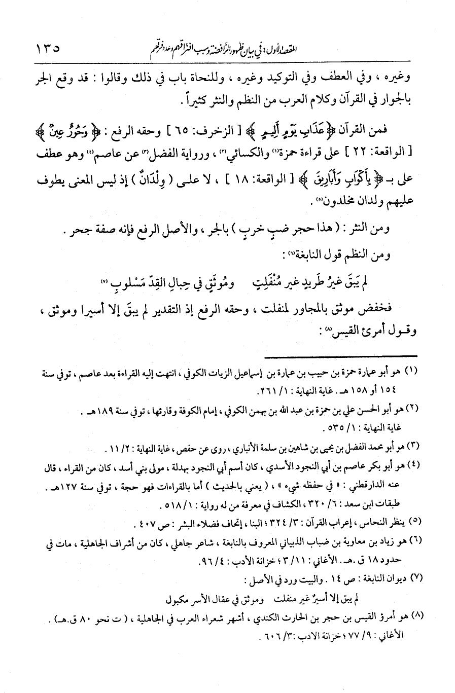 وغيره وفي العطف وفي التوكيد وغيره. وللنحاة باب في ذلك، وقالوا: قد وقع الجر بالجوار في القرآن وكلام العرب من النظم والنثر كثيرا. فمن القرآن {عَذَابِ يَوْمٍ أَلِيمٍ}، وحقه الرفع، {وَحُورٌ عِينٌ} على قراءة حمزة والكسائي ورواية الفضل عن عاصم، وهو عطف عام ب {بِأَكْوَابٍ وَأَبَارِيقَ} لا على {وِلْدَانٌ} إذ ليس المعنى يطوف عليهم ولدان مخلدون. ومن النثر: "هذا حجر ضبٍّ خربٍ" بالجر، والأصل الرفع فإنه صفة جحر. ومن النظم قول النابغة:
