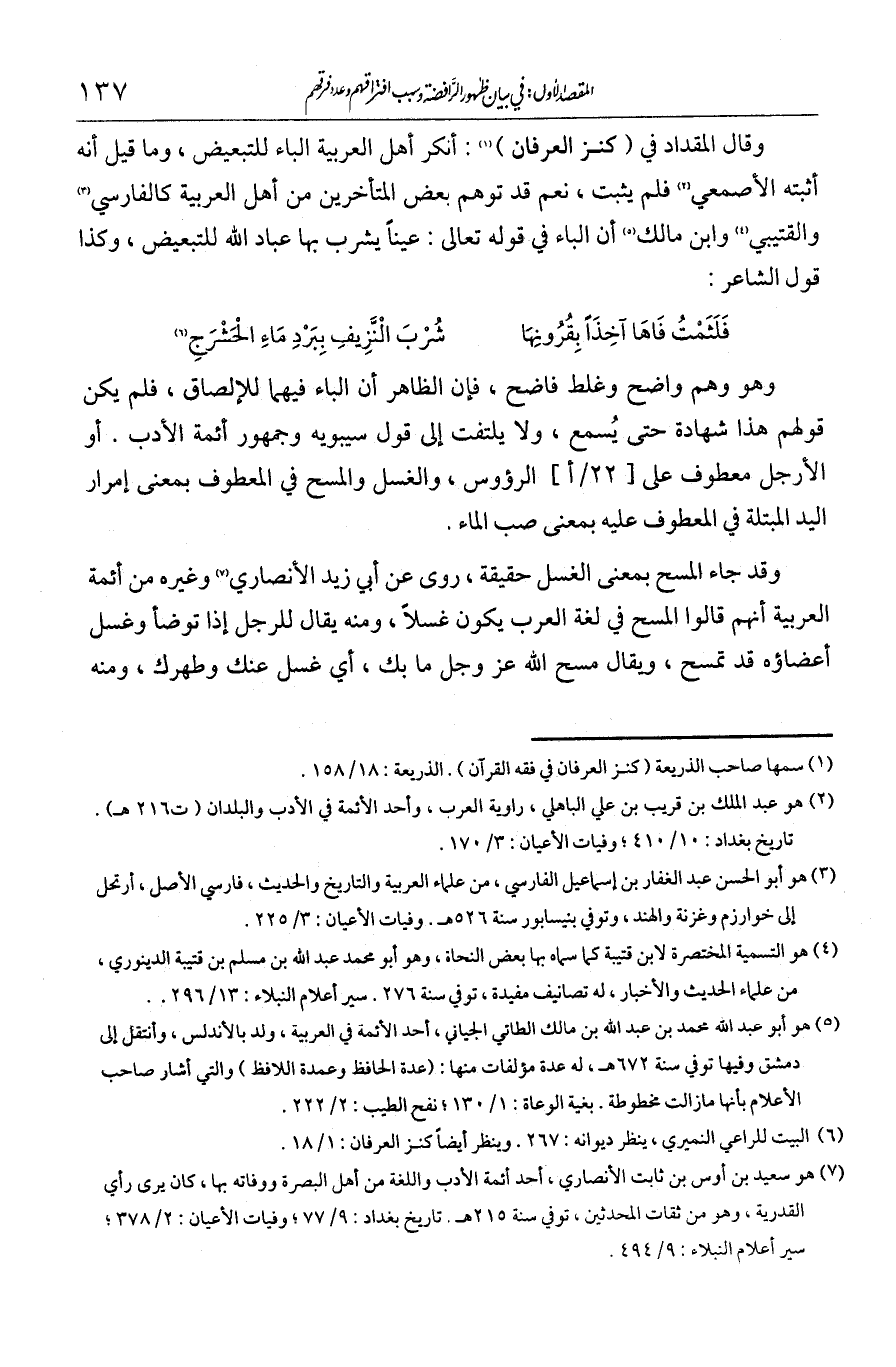 وقال المقداد في كنز العرفان: أنكر أهل العربية الباء للتبعيض، وما قيل إنه أثبته الأصمعي فلم يثبت، نعم قد توهم بعض المتأخرين من أهل العربية كالفارسي والقتيبي وابن مالك أن الباء في قوله تعالى: {عَيْنًا يَشْرَبُ بِهَا عِبَادُ اللَّهِ} للتبعيض، وكذا قول الشاعر: