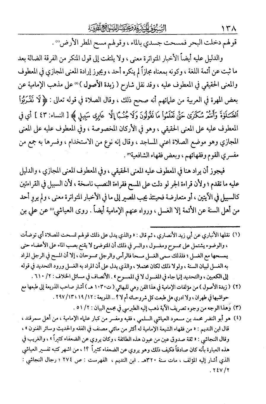 والدليل عليه أيضا الأخبار المتواترة معنى، ولا يلتفت إلى قول المنكر من الفرقة الضالة بعد ما ثبت عن أئمة اللغة، وكونه بمعناه مجازا لم ينكره أحد، ويجري إرادة المعنى المجازي في المعطوف والمعنى الحقيقي في المعطوف عليه. وقد نقل شارح زبدة الأصول على مذهب الإمامية عن بعض المهرة في العربية من علمائهم أنه صحح ذلك، وقال الصلاة في قوله تعالى: {لَا تَقْرَبُوا الصَّلَاةَ وَأَنْتُمْ سُكَارَى حَتَّى تَعْلَمُوا مَا تَقُولُونَ وَلَا جُنُبًا إِلَّا عَابِرِي سَبِيلٍ}، أي في المعطوف عليه على المعنى الحقيقي، وهو في الأركان المخصوصة، وفي المعطوف عليه على المعنى المجازي وهو موضع الصلاة أعني المساجد، وقال إنه نوع من الاستخدام. وفسرها به جمع من مفسري القوم وفقهائهم، وبعض فقهاء الشافعية. فيجوز أن يراد هنا في المعطوف عليه المعنى الحقيقي، وفي المعطوف المعنى المجازي، والدليل عليه ما تقدم. ولأن قراءة الجر لو دلت على المسح فقراءة النصب ناسخة، لأن السبيل في القراءتين كالسبيل في الآيتين، أو متعارضة فحينئذ يجب المصير إلى ما في الأخبار المتواترة معنى. ولم يرو أحد من أهل السنة عن الأئمة إلا الغسل، ورواه عنهم الإمامية أيضا. روى العياشي عن علي بن