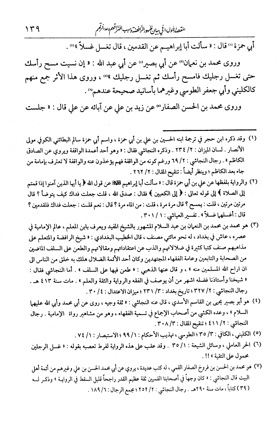 أبي حمزة قال: سألت أبا إبراهيم عن القدمين، قال: تغسلا غسلا. وروى محمد بن نعمان عن أبي بصير عن أبي عبد الله: إن نسيت مسح رأسك حتى تغسل رجليك فامسح رأسك ثم تغسل رجليك. وروى هذا الأثر جمع منهم كالكليني وأبي جعفر الطوسي وغيرهما بأسانيد صحيحة عندهم. وروى محمد بن الحسن الصفار عن زيد بن علي عن آبائه عن علي قال: جلست
