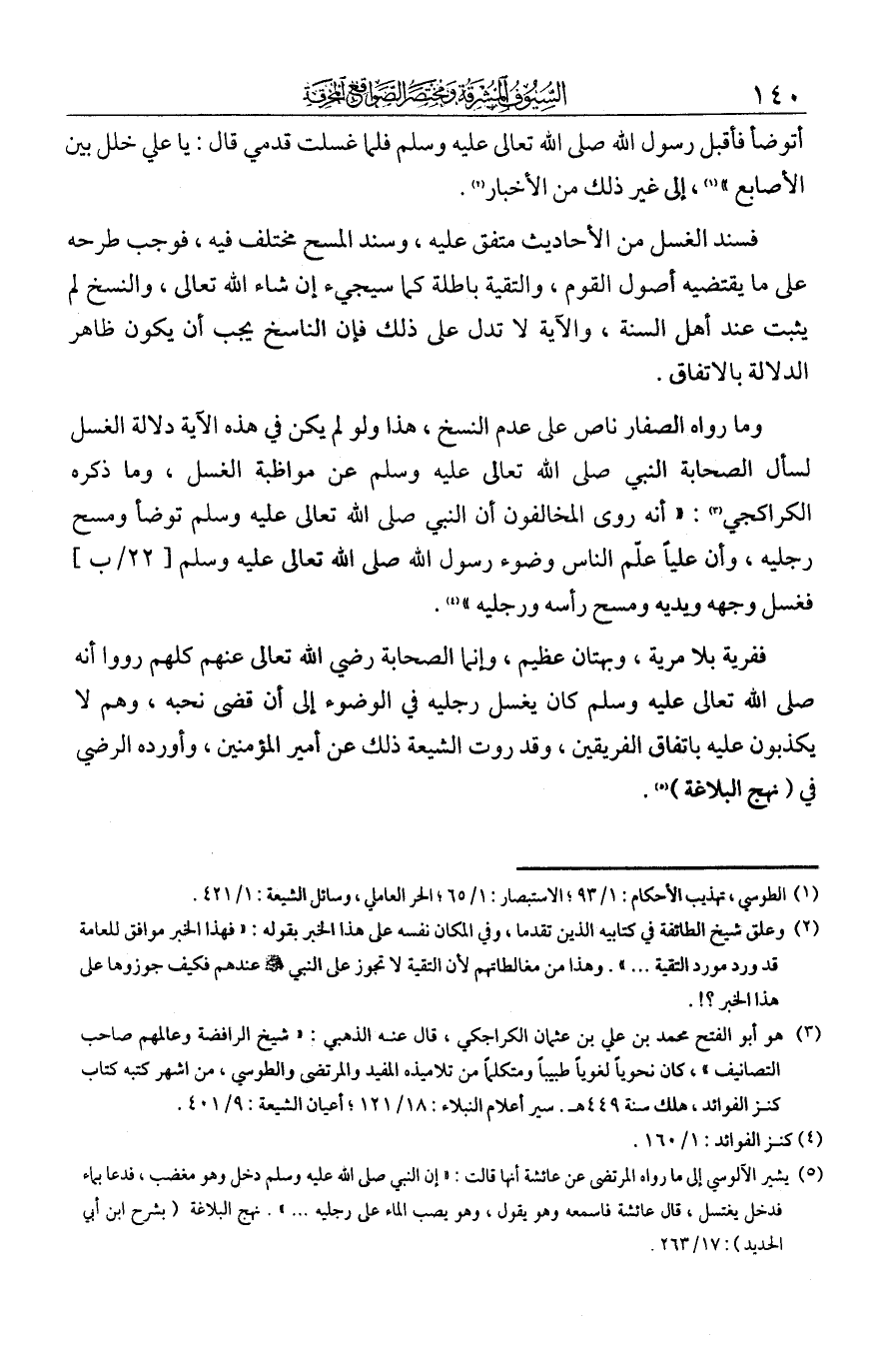 هذا ولو لم يكن في هذه الآية دلالة الغسل لسأل الصحابة النبي - صلى الله عليه وسلم - عن مواظبة الغسل، وما ذكره الكراكجي: أنه روى المخالفون أن النبي - صلى الله عليه وسلم - توضأ ومسح رجليه، وأن عليا علم الناس وضوء رسول الله - صلى الله عليه وسلم - فغسل وجهه ويديه ومسح رأسه ورجليه؛ ففرية بلا مرية، وبهتان عظيم، وإنما الصحابة رضي الله تعالى عنهم كلهم رووا أنه - صلى الله عليه وسلم - كان يغسل رجليه في الوضوء إلى أن قضى نحبه، وهم لا يكذبون عليه باتفاق الفريقين. وقد روت الشيعة ذلك عن أمير المؤمنين، وأورده الرضي في نهج البلاغة.
