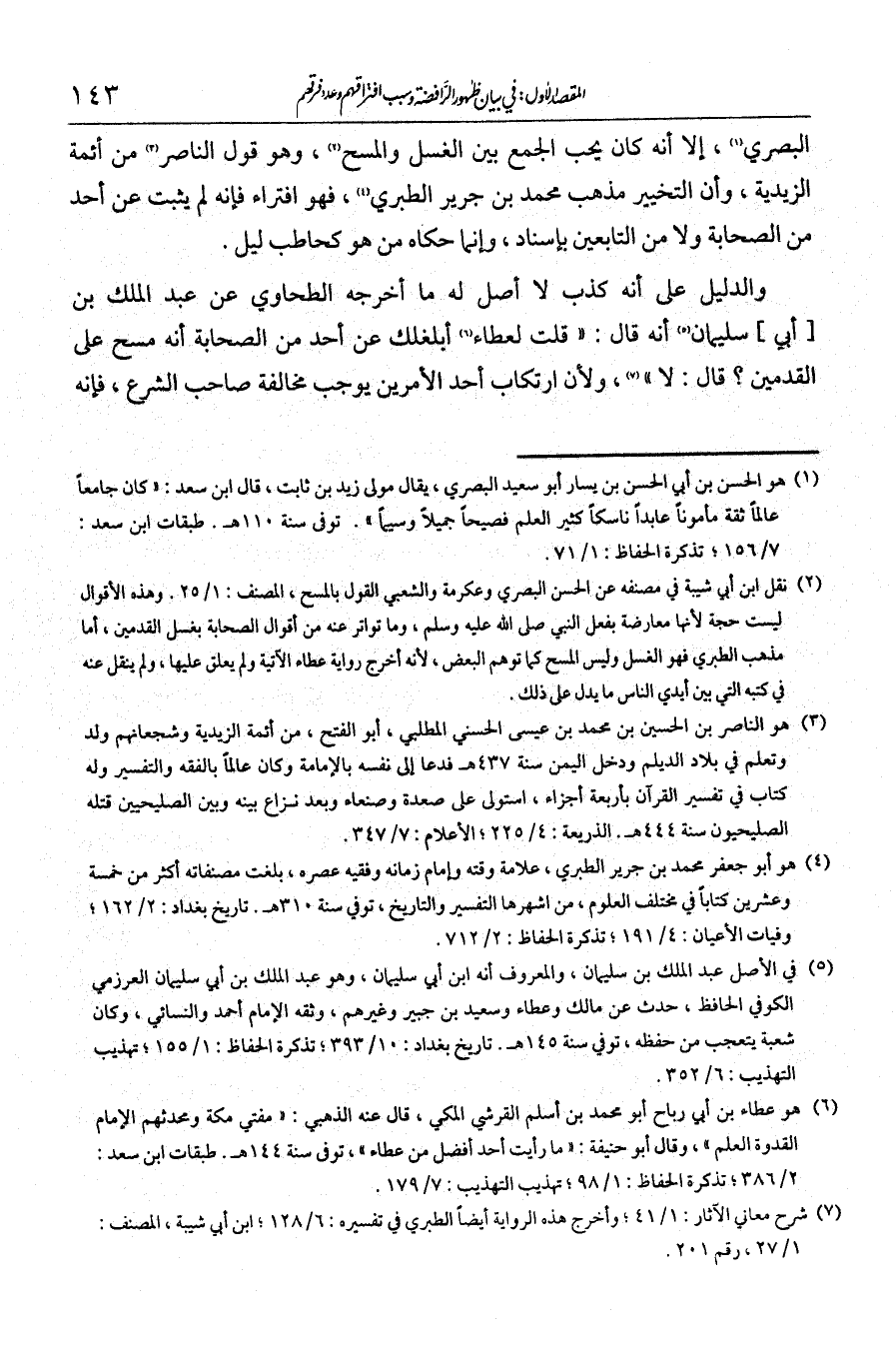 البصري، إلا أنه كان يحب الجمع بين الغسل والمسح، وهو قول الناصر من أئمة الزيدية، وأن التخيير مذهب محمد بن جرير الطبري؛ فهو افتراء، فإنه لم يتثبت عن أحد من الصحابة ولا من التابعين بإسناد، وإنما حكاه من هو كحاطب ليل. والدليل على أنه كذب لا أصل له ما أخرجه الطحاوي عن عبد الملك بن أبي سليمان أنه قال: قلت لعطاء: أبلغك عن أحد من الصحابة أنه مسح على القدمين؟ قال: لا.